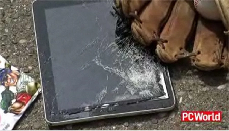 Trên YouTube cũng xuất hiện một video trình diễn cảnh "tra tấn" máy tính bảng bằng gậy bóng chày. Xem video.