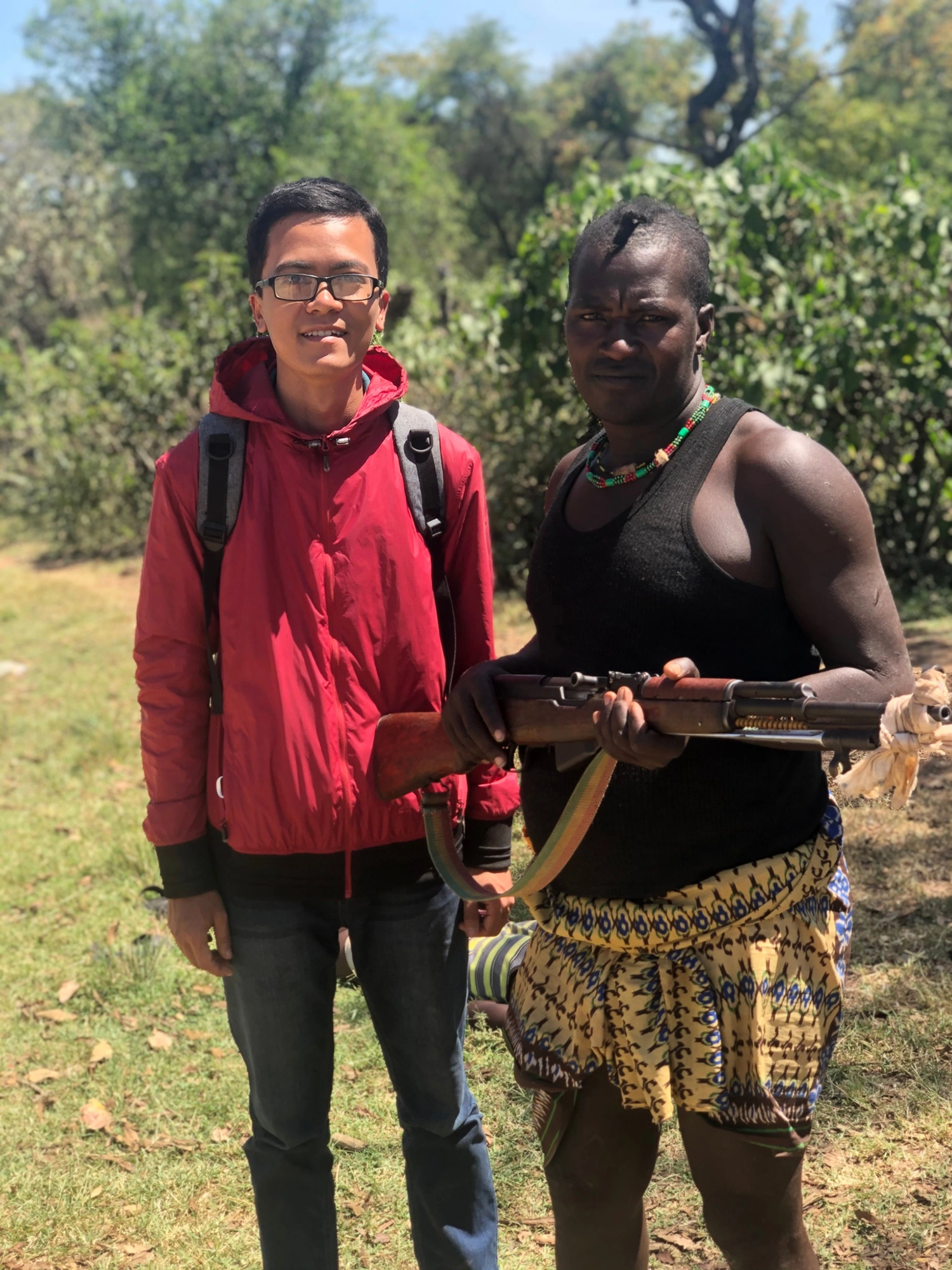Ngày thứ 3, tôi và Degu đi xe máy khám phá các bộ lạc phía nam. Hành trình gần 100 km, khung cảnh dọc đường có nhiều nét giống với miền núi phía Bắc Việt Nam. Nhưng điều hơi kỳ lạ khiến tôi phải thắc mắc với Degu, đó chính là bắt gặp rất nhiều người đi bộ trên đường cầm súng, kể cả mấy chàng trai chăn gia súc. Hoá ra, nơi đây giáp biên giới với Kenya và Nam Sudan, an ninh bất ổn, thỉnh thoảng có xung đột vũ trang hoặc xuất hiện những toán cướp. Dù vậy, mọi người trông vẫn thong thả làm công việc của mình nên tôi không cảm thấy quá sợ hãi.