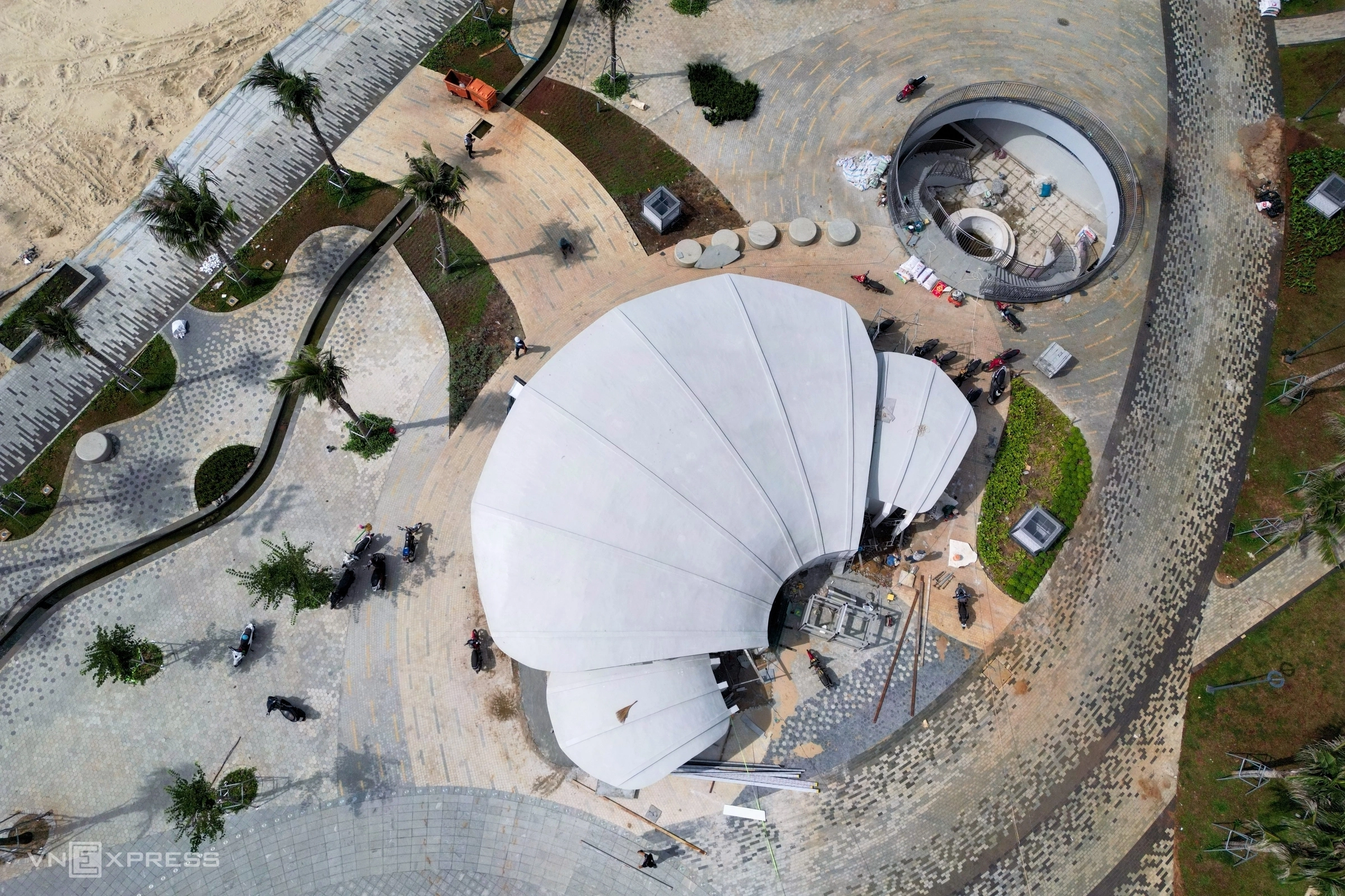 Tại công trình tháp biểu tượng Tam Thắng do Sun Group tài trợ, đơn vị thi công đang lắp đặt các cột trụ hình tam giác cao dần về phía biển, từ 10,9 m đến hơn 31,6 m. Dự kiến công trình này cũng sẽ được hoàn thành vào cuối tháng 8.