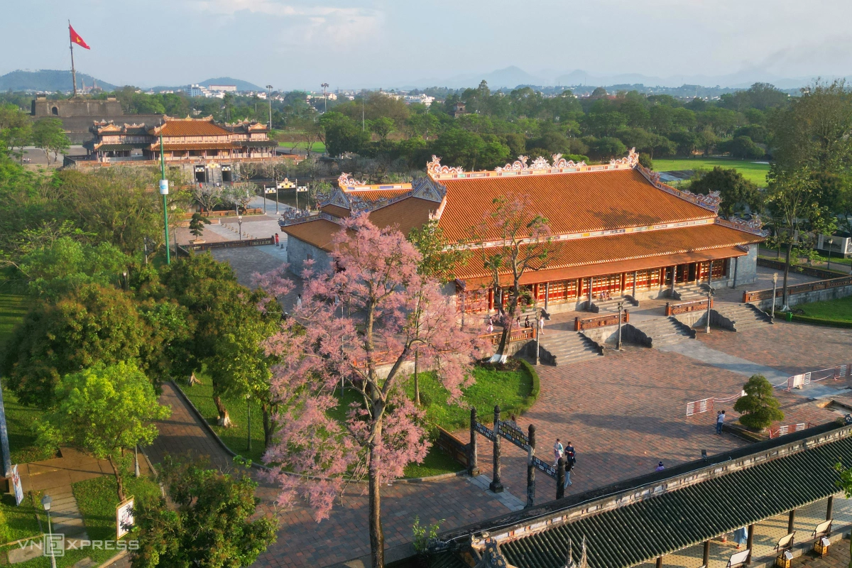 Từ nhiều năm nay, cây ngô đồng phía sau điện Thái Hòa trở thành điểm check in hút khách ở Đại nội Huế mỗi mùa hoa nở.