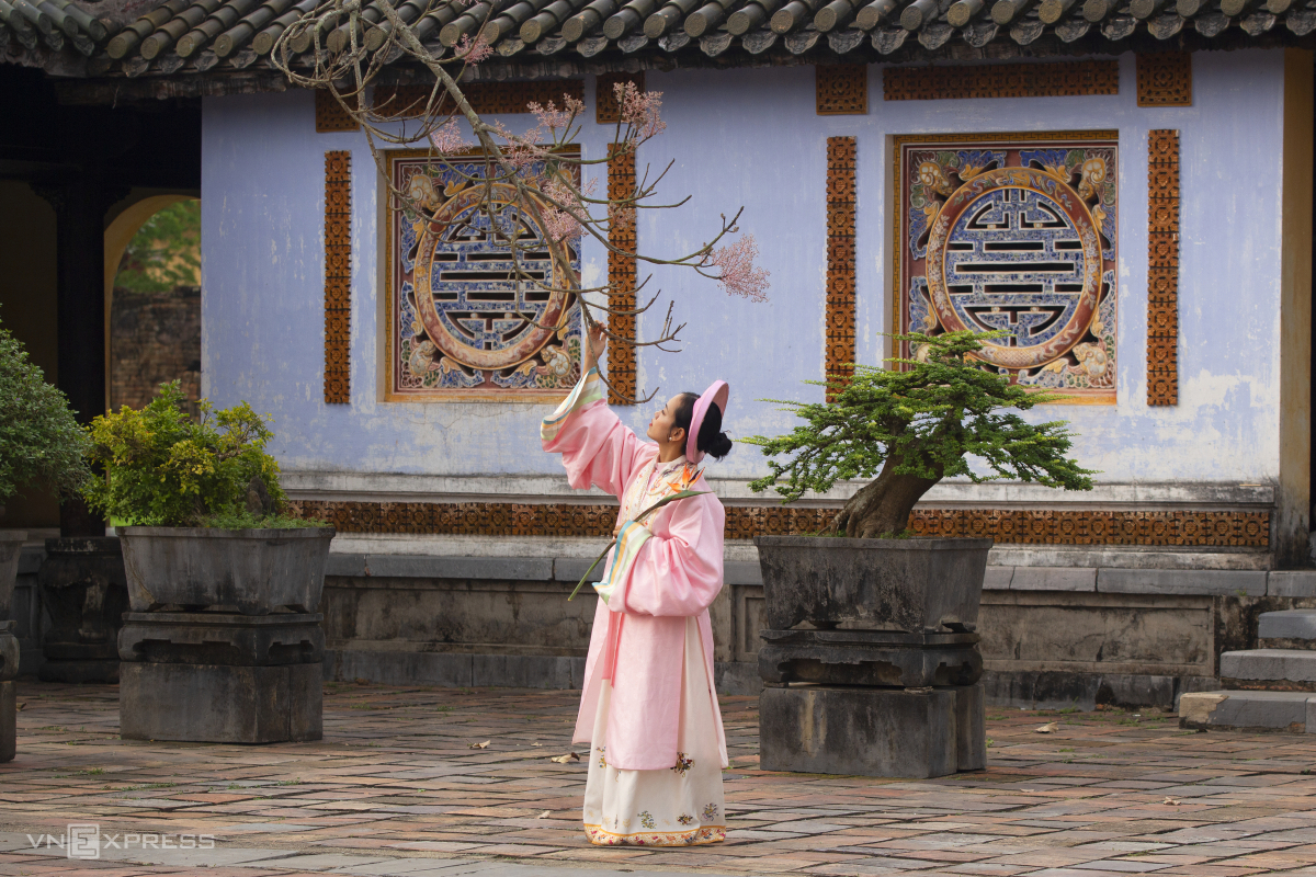 Nhiều du khách thuê cổ phục để vào hoàng cung Huế ghi lại những bức ảnh mùa hoa ngô đồng.