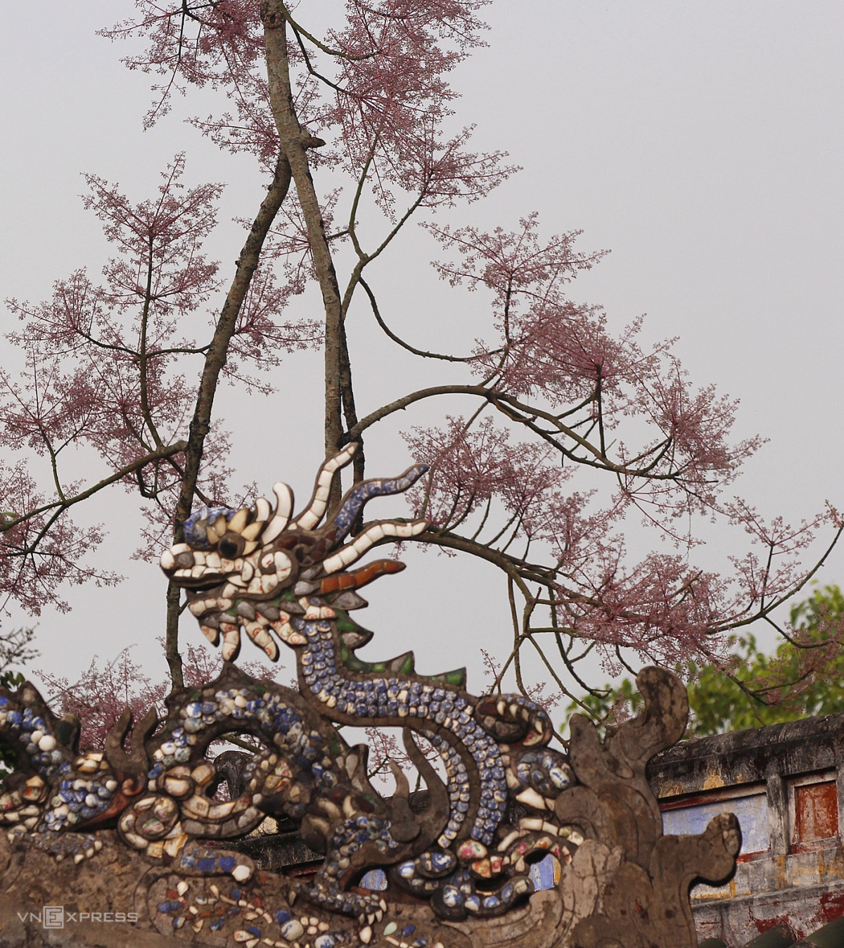 Sắc hoa tím hồng bên nét cổ kính của các con rồng sành sứ đắp nổi trên các công trình ở hoàng cung.