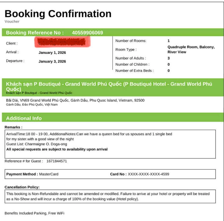 Trong ngày 1/1, Doga-ong, du khách Philippines, cũng tố một cơ sở lưu trú ở Gành Dầu bùng phòng từ 1/1 đến 3/1 dù đã thanh toán đủ 2,6 triệu đồng qua Agoda vào 24/11/2025. Trước đó, cô đã nhận đủ giấy tờ xác nhận đặt phòng, thanh toán từ tài khoản Chăm sóc khách hàng của Agoda.