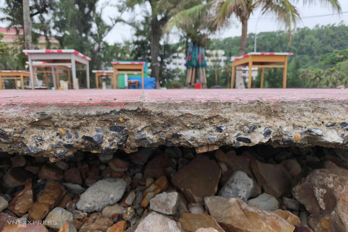 Vỉa hè sát biển khu vực sân tiêu năng phía trước khách sạn Công đoàn cũ bị nghiêng, lún, xói mòi, hở hàm ếch. Tuy nhiên, một số nhà hàng ăn uống vẫn bất chấp nguy hiểm, kê bàn ghế tại đây để phục vụ du khách.