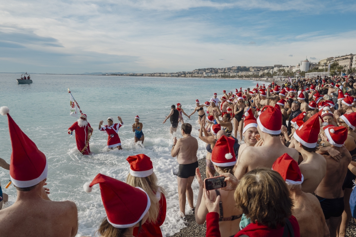 Người dân đội mũ Ông già Noel tắm biển theo truyền thống dịp Giáng sinh ở thành phố Nice, Pháp ngày 22/12.
