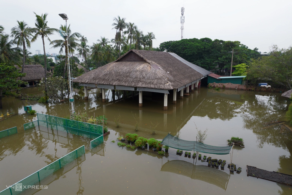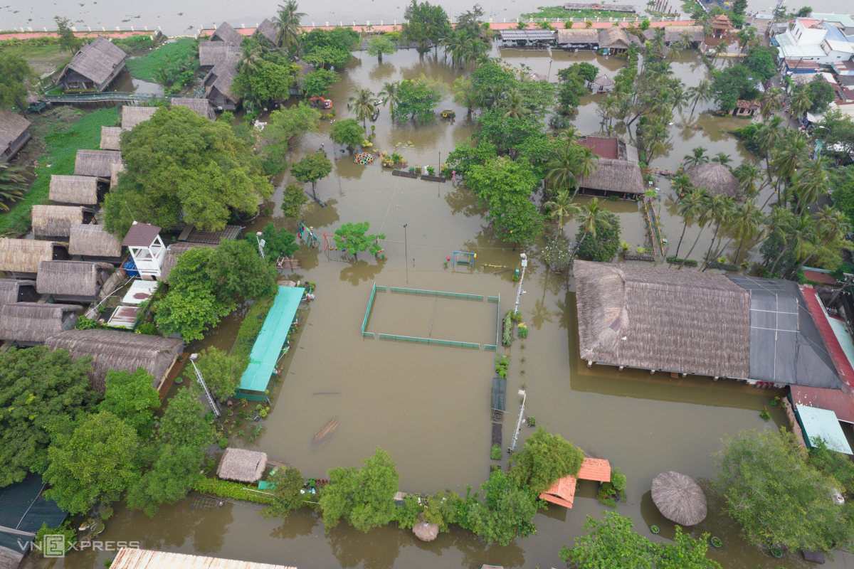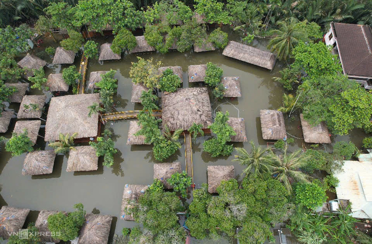 Khu du lịch ven sông nổi tiếng ở TP HCM gồm 34 phòng nghỉ, sân khấu, khu vui chơi trẻ em, sân thể thao và nhiều phòng chức năng, nay đều chìm trong biển nước.