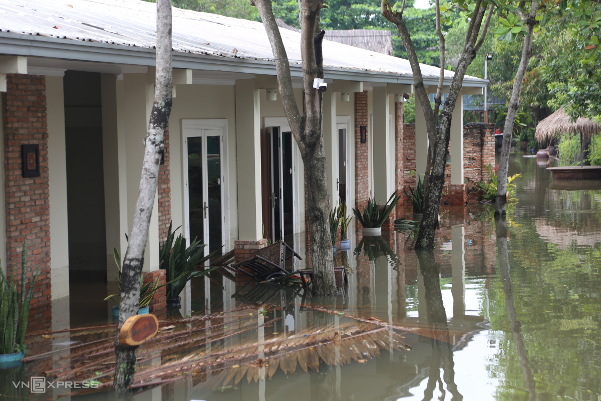 Dãy phòng nghỉ của khu du lịch cũng bị ngập, nước cuốn theo rác và lá cây tràn vào bên trong.