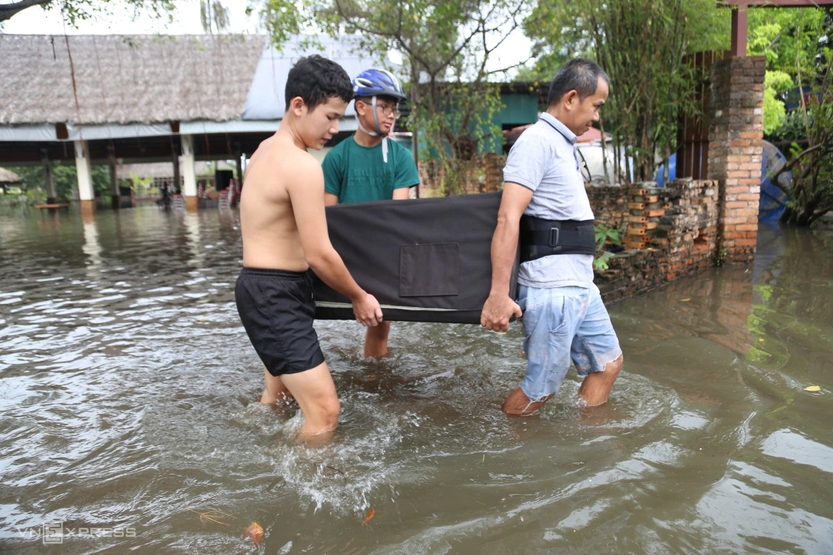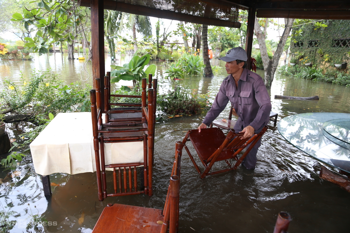 Anh Hậu, nhân viên nhà hàng, cho biết nước dâng từ đêm qua, có nơi cao đến ngang ngực khiến anh di chuyển khó khăn. Sáng nay, khi nước rút, anh bắt đầu thu dọn bàn ghế trôi nổi, vệ sinh các phòng.