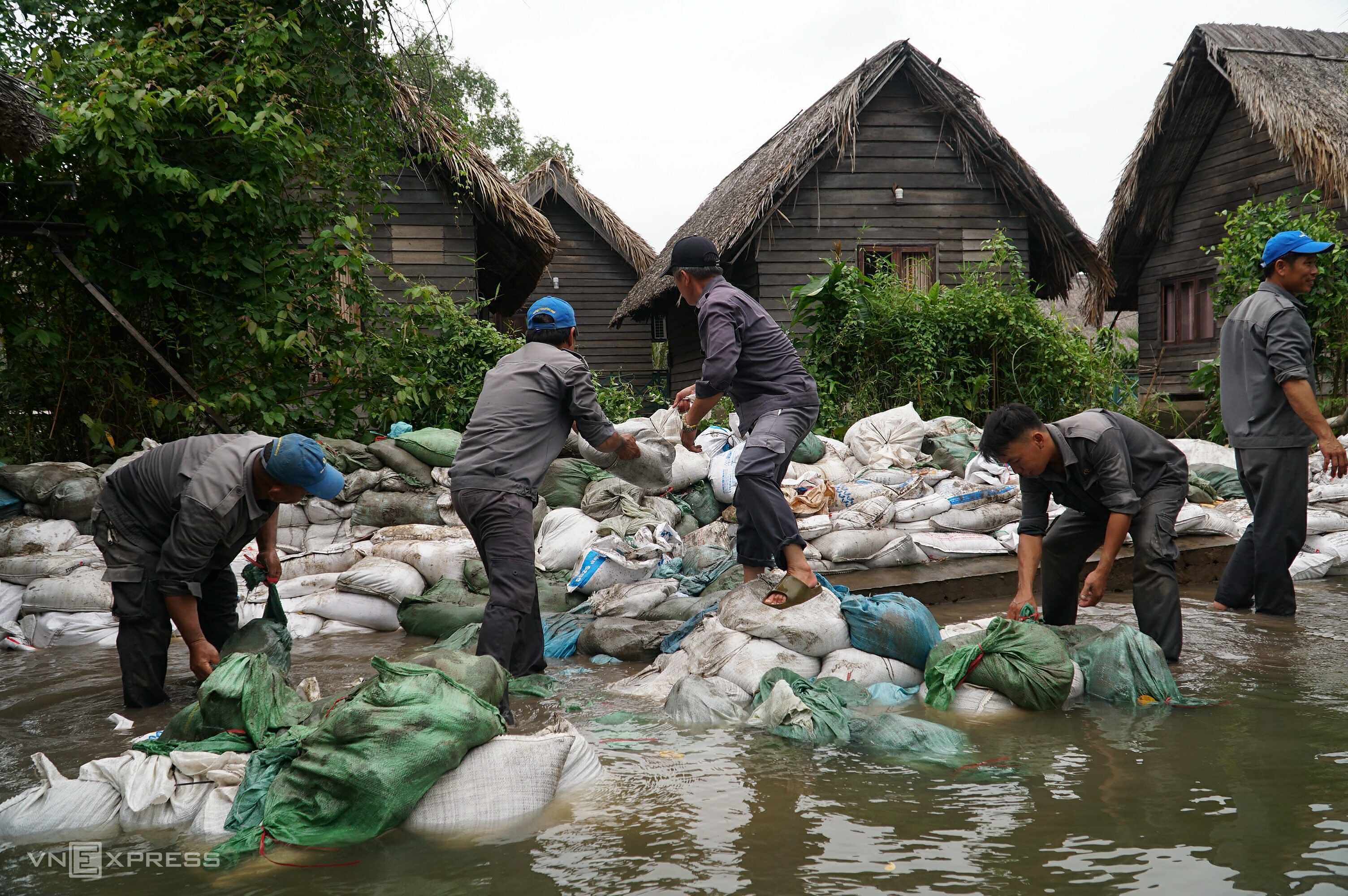 Tại những chỗ vùng thấp, nhân viên khu du lịch phải chèo ghe để đi lại, dọn dẹp đồ đạc.