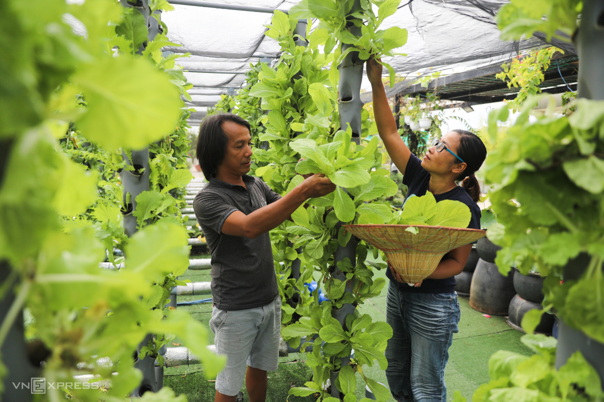Anh Hoà cùng vợ - chị Lê Hồng Anh - thu hoạch rau cải được trồng bằng mô hình khí canh trên sân thượng.