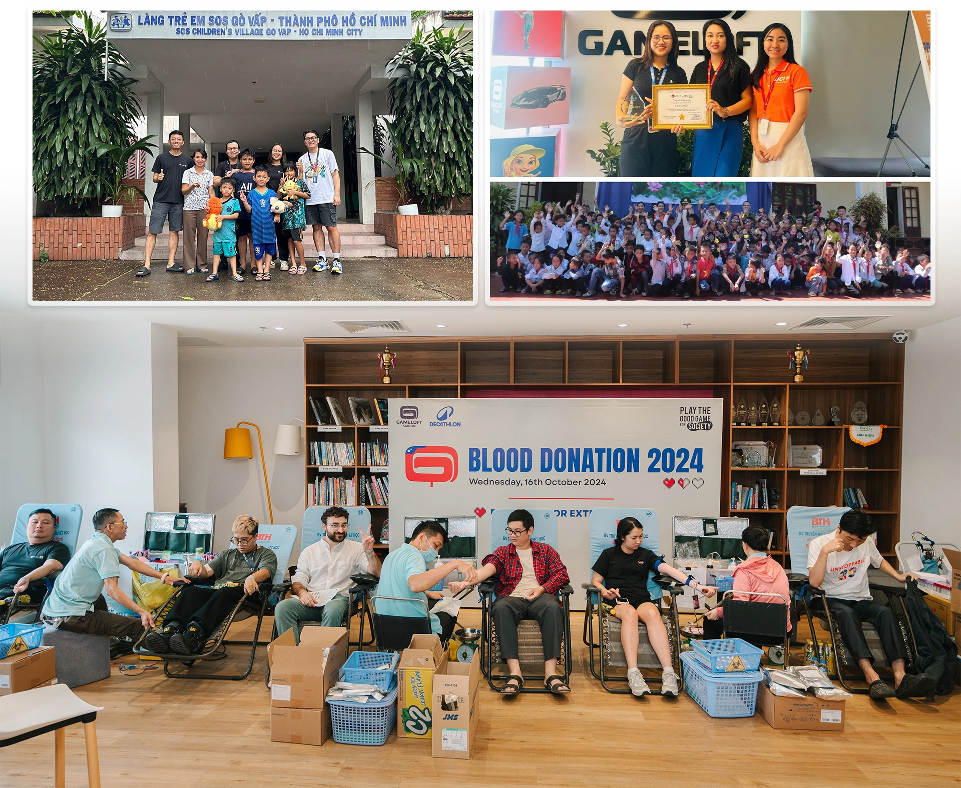 Chẳng hạn, tháng 11, 15 nhân viên Gameloft đã tham gia giải bóng đá thiện nguyện Foot for Hope. Từ đây, các thành viên quyên góp hơn 10 triệu đồng hỗ trợ trẻ em nghèo thông qua tổ chức Coup de Pouce Vietnam. Giữa tháng 9, khi bão Yagi tàn phá miền Bắc, Gameloft Việt Nam nhanh chóng cùng JCI Việt Nam và UNICEF tổ chức chương trình quyên góp cứu trợ. Chương trình thu gom đồ dùng học tập, quần áo trẻ em và hàng hóa thiết yếu, giúp đỡ những người khó khăn sớm ổn định cuộc sống.