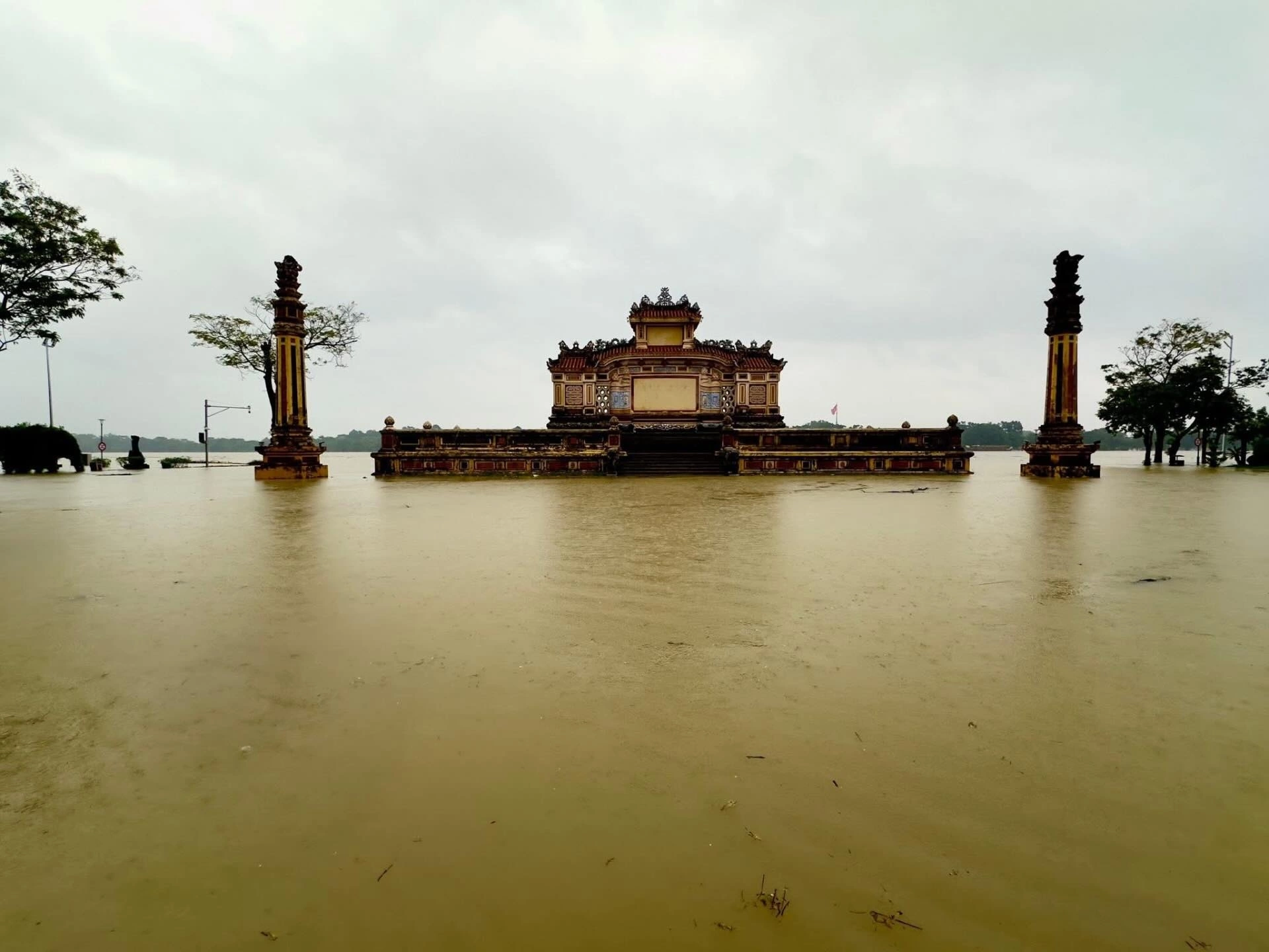 Hai ngày qua, lũ từ thượng nguồn sông Hương đổ về cùng mưa lớn cục bộ đã gây ngập kinh thành Huế, khiến nhiều di tích chìm sâu 2 m. Sau khi đạt đỉnh vào đêm qua, lũ sông Hương xuống chậm, hiện khu vực kinh thành vẫn ngập hơn 1 mét.