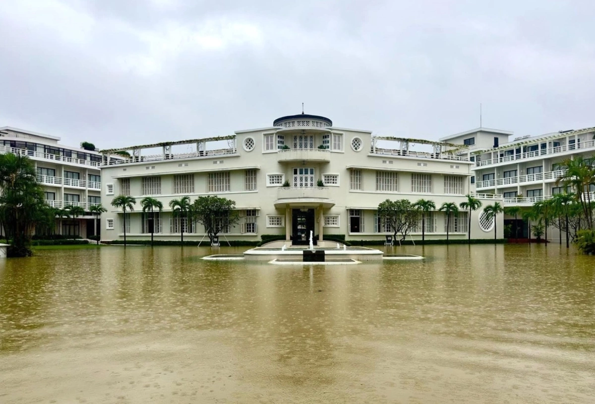 Một phần khuôn viên khách sạn Azerai La Residence nằm bên bờ sông Hương ngập trong nước. Công trình được xây dựng năm 1930, trên diện tích hơn 2,5 ha chạy dọc bờ sông Hương.