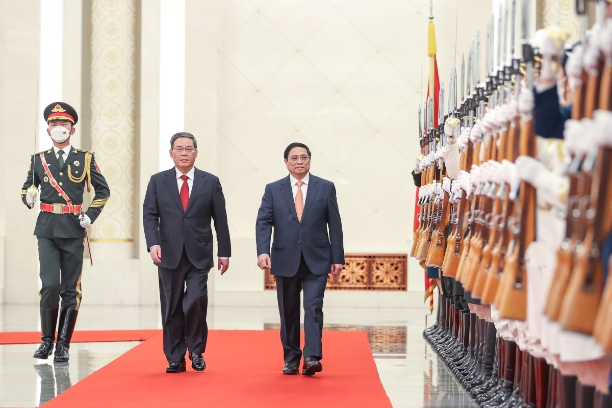 Sau lễ chào cờ, Thủ tướng Lý Cường và Thủ tướng Phạm Minh Chính duyệt đội danh dự.