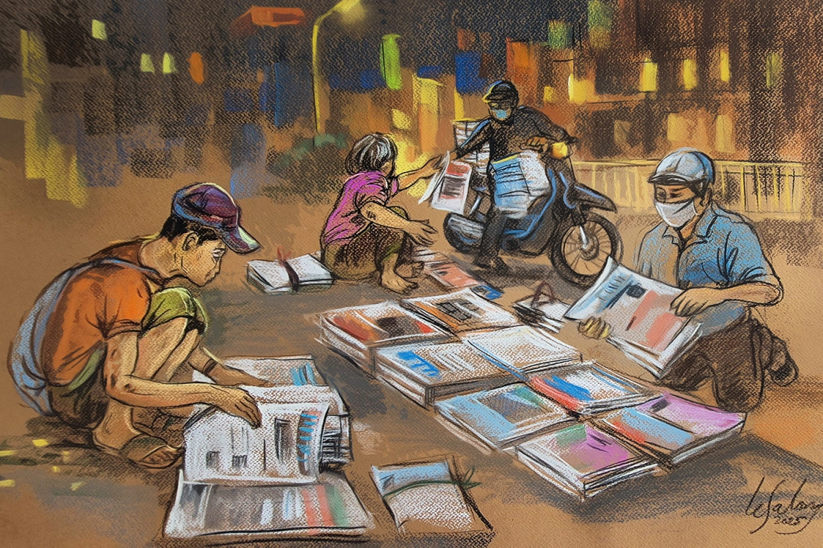 Họa sĩ thực hiện bộ tranh dịp 100 năm ngày Báo chí cách mạng Việt Nam. Anh vẽ lại cảnh "chợ báo" nhộn nhịp lúc 2h trước cổng nhà in Lê Quang Lộc trên đường Lý Chính Thắng (quận 3, TP HCM). Một thời, đây là nơi các đại lý nhận báo từ các tòa soạn, sau đó phân phát cho đại lý nhỏ và người bán báo dạo.