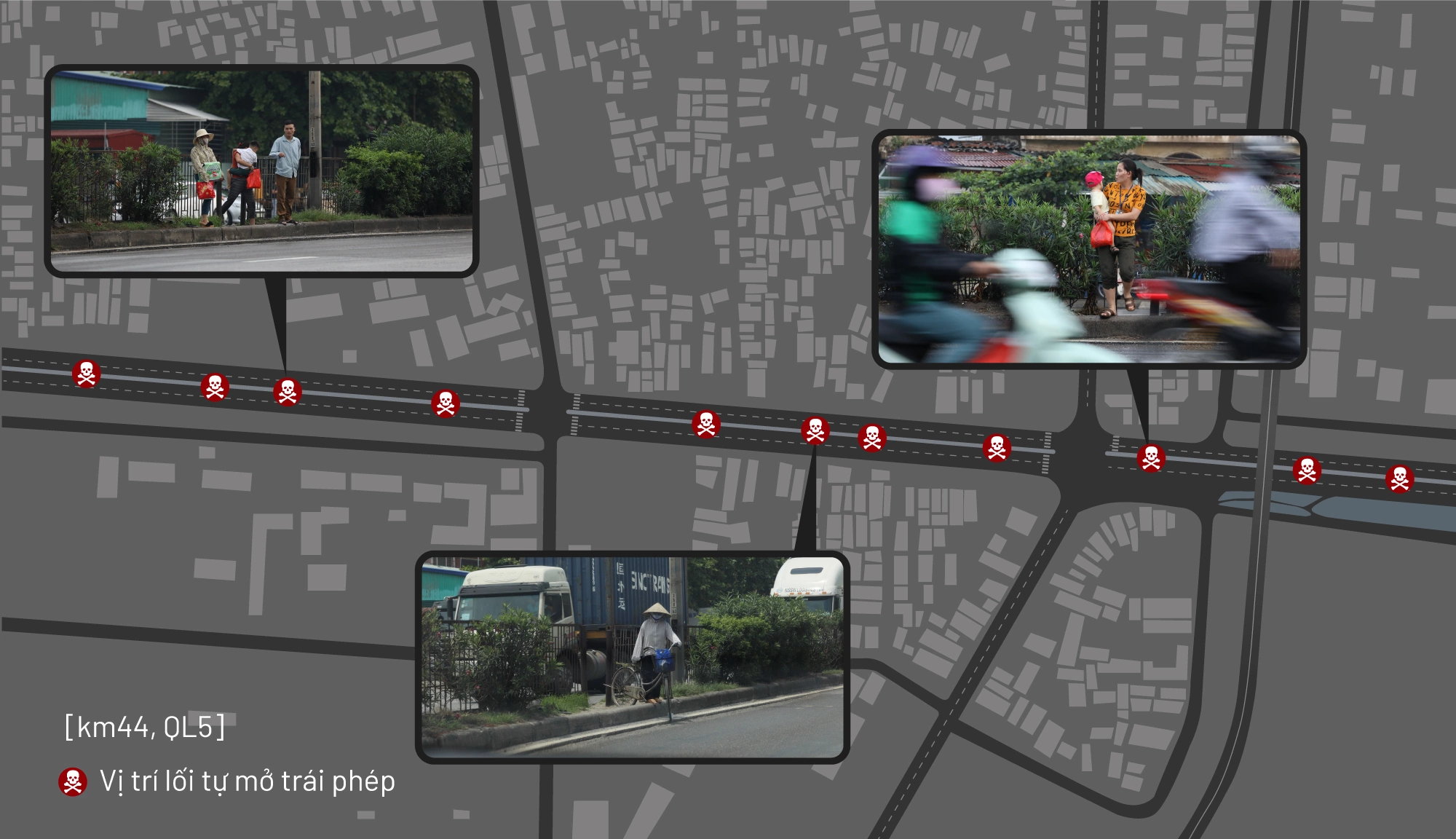 Trên tuyến phố khổng lồ này, người dân hai bên đường sẽ đập bằng dải phân cách cứng để mở lối sang đường cho xe thô sơ như ở xã Cộng Hòa, hoặc sẽ cưa những thanh rào sắt để người đi bộ chui qua. Họ sẽ phải len lỏi trong làn container, bê những chiếc xe đạp của mình qua rào sắt. Khảo sát 5,3 km quốc lộ 5 đi qua thị trấn Lai Cách, Hải Dương, phóng viên VnExpress ghi nhận 40 lối đi tự mở.