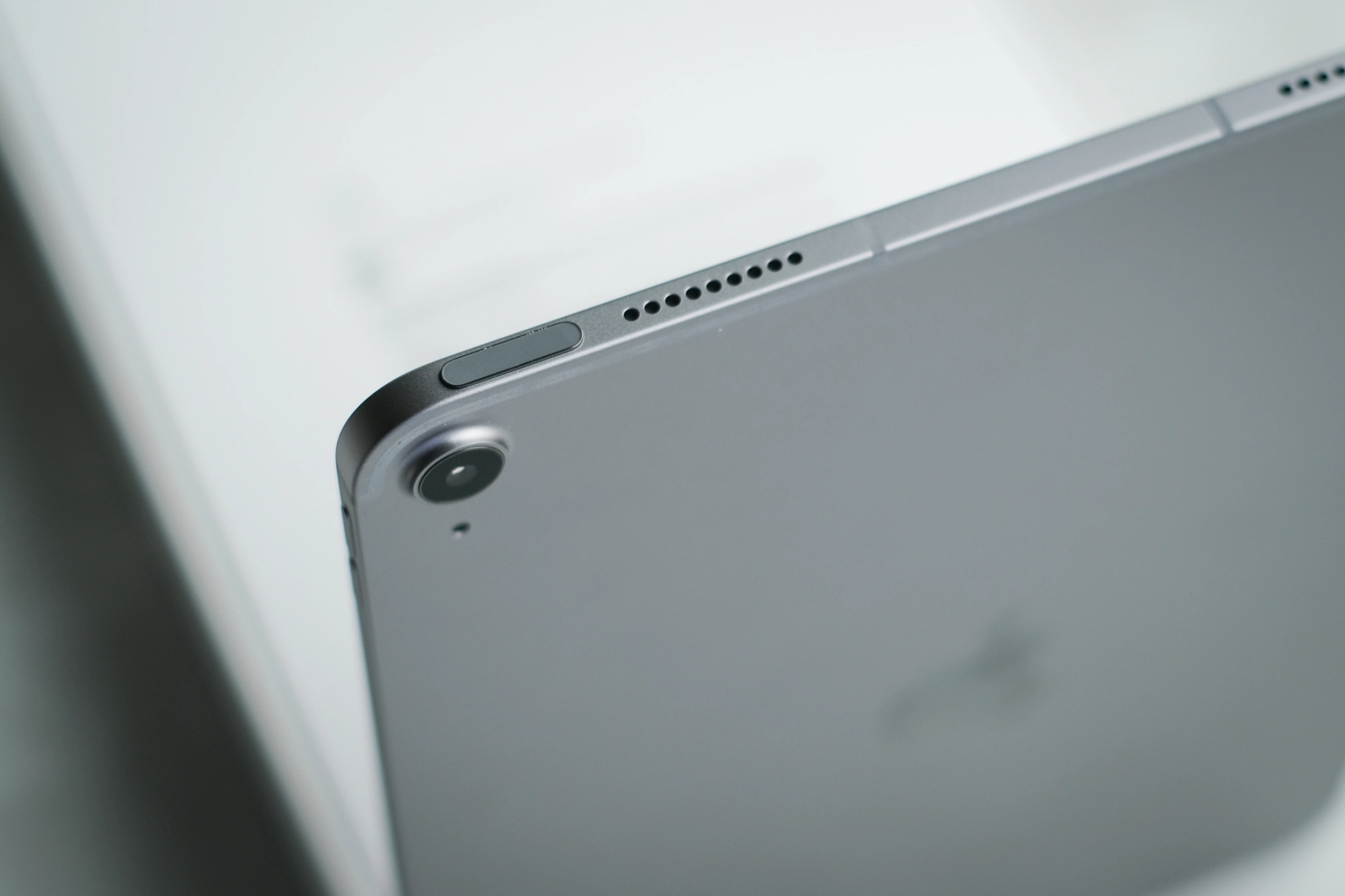 Độ mỏng ấn tượng của iPad Air được thể hiện rõ khi nhìn từ góc ngang. Máy vẫn được trang bị đầy đủ thành phần, gồm hệ thống loa kép xung quanh thân, cổng USB-C và một nút nguồn tích hợp cảm biến vân tay. Các chi tiết được hoàn thiện cao cấp, chắc chắn. Máy cũng hỗ trợ kết nối 5G, tuy nhiên không có khay sim vật lý và người dùng cần thêm esim.