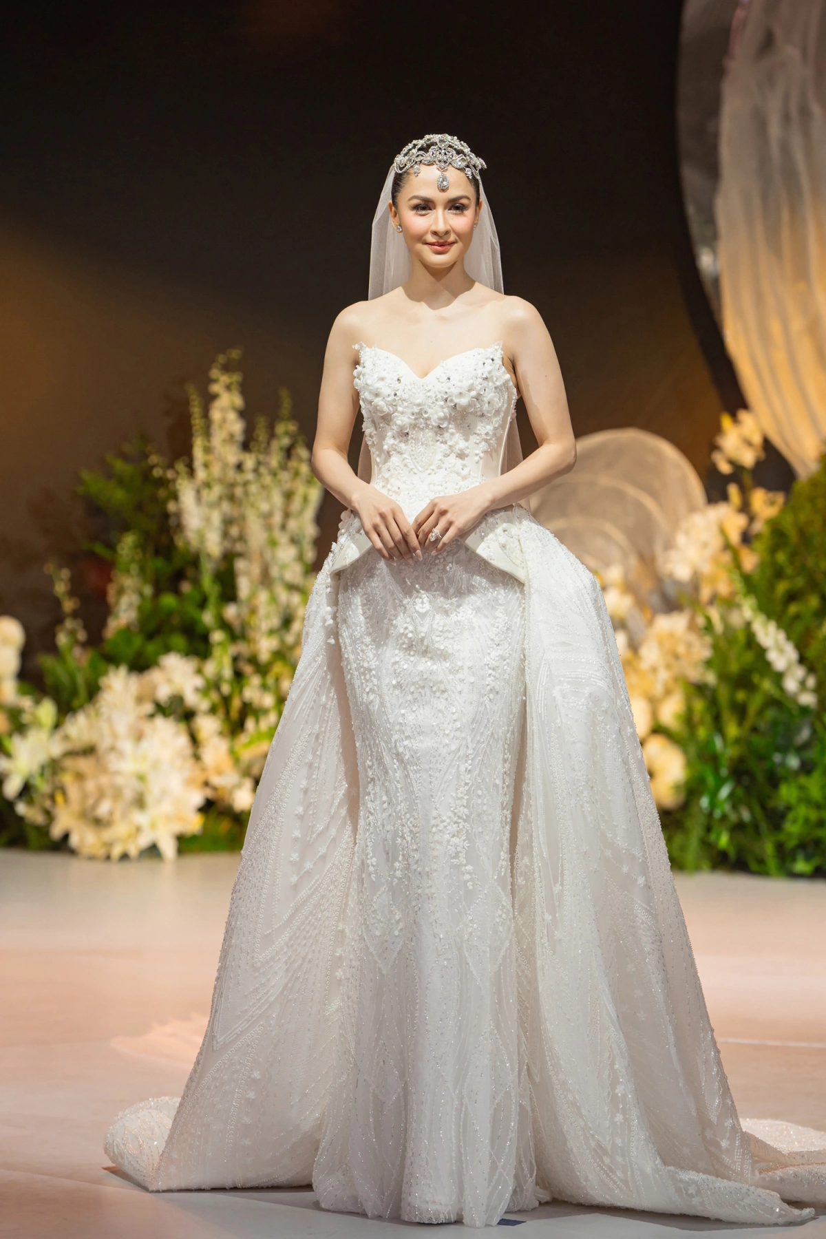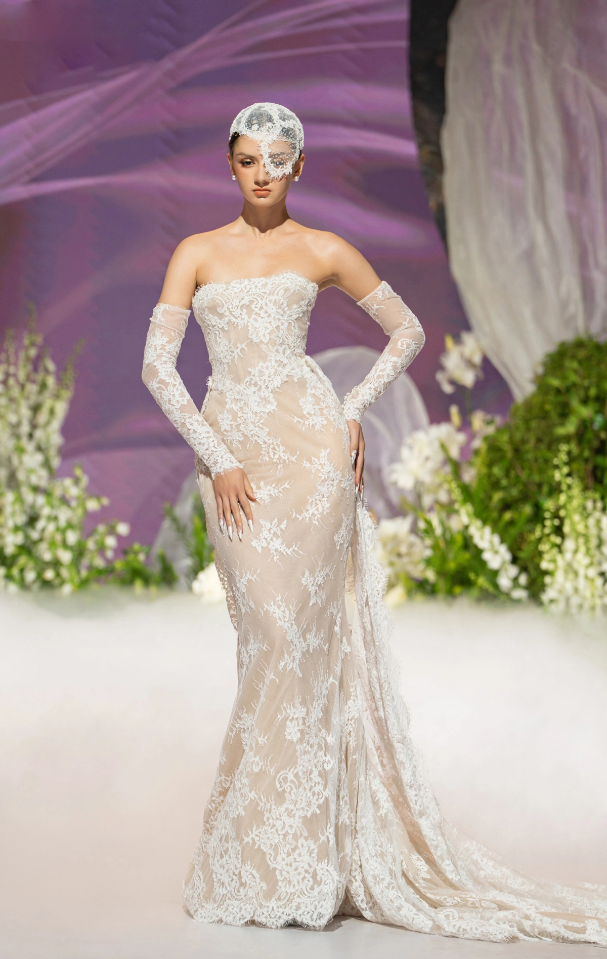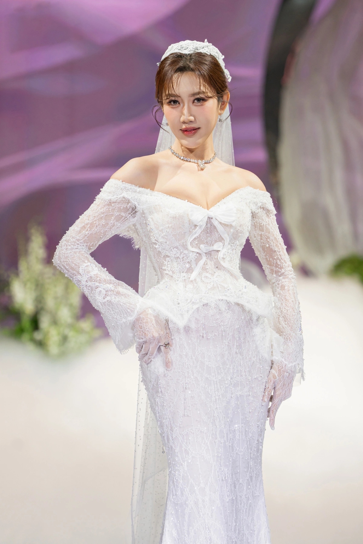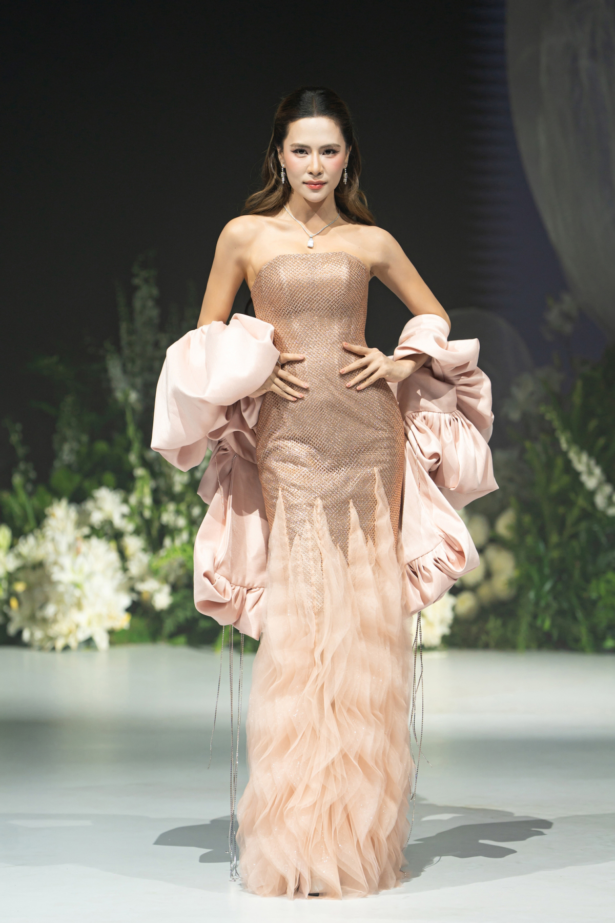 Diễn viên Thúy Ngân mở màn trong đầm đuôi cá do 10 nghệ nhân thực hiện trong ba tháng. Phần corset tay dài được làm bằng ren Chantilly của Pháp, đính ngọc trai và pha lê chạy dọc khắp thân váy. Điểm nhấn là chi tiết nơ 3D uốn lượn.