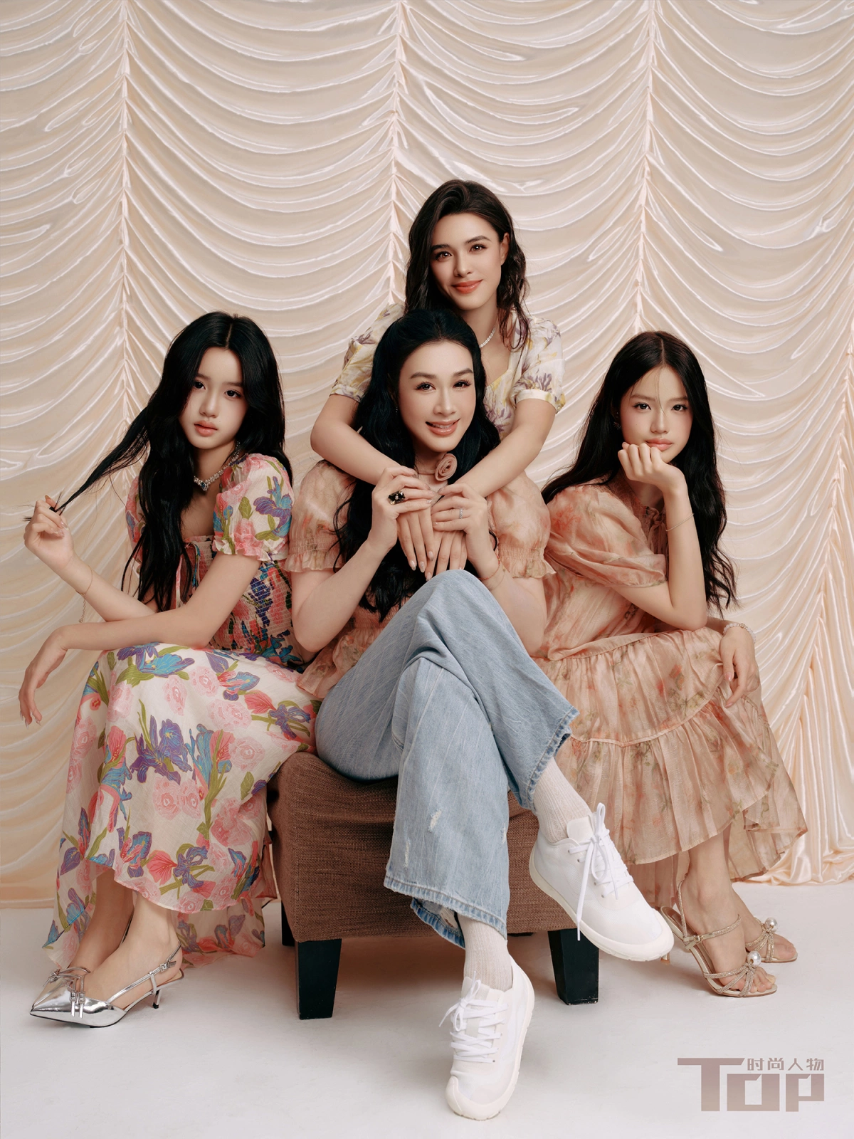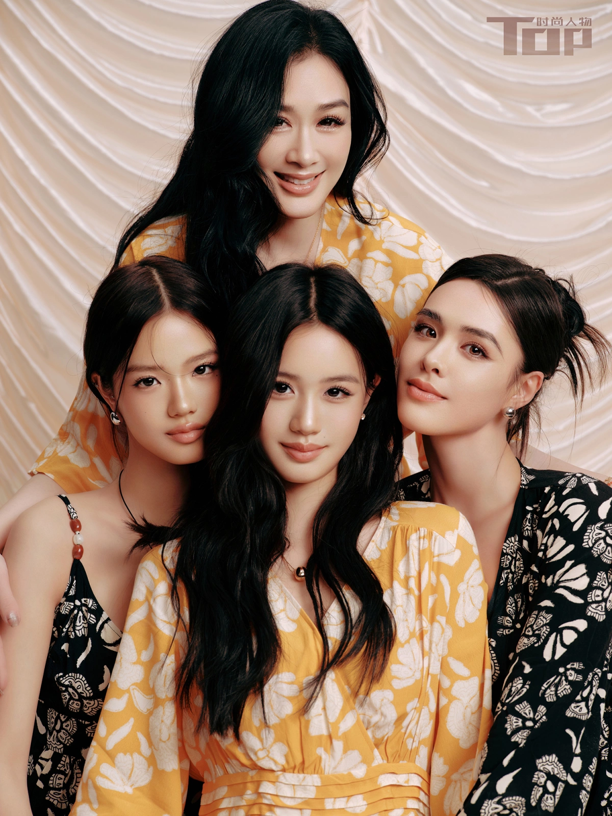 Bốn mẹ con diện nhiều dạng trang phục, từ trái sang: Trương Tư Tiệp, Chung Lệ Đề, Yasmine Ross, Trương Khải Lâm.