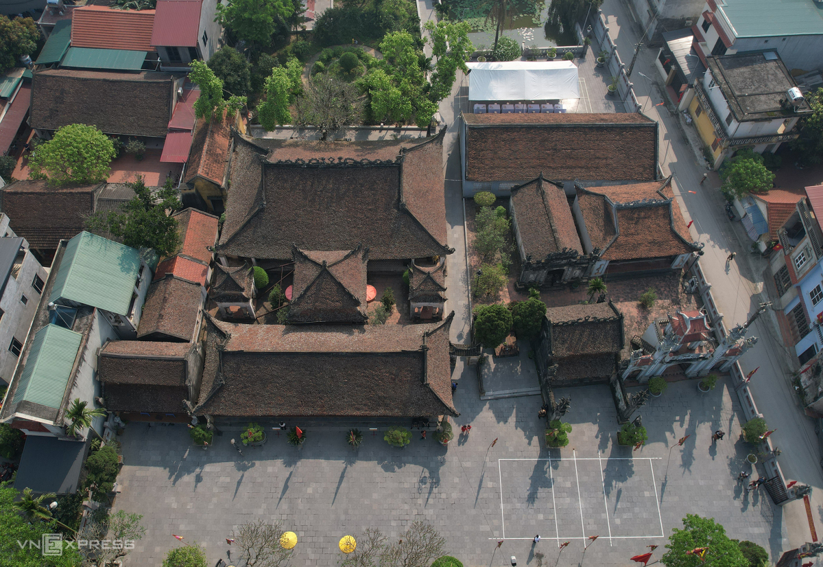 Tòa đại đình là công trình lớn nhất trong khuôn viên, kiến trúc thời Lê gần như còn lưu giữ được nguyên vẹn với 4 mái rộng cao, 4 góc đao cong vút như 4 cánh hoa xòa nở. Nóc đình đắp lưỡng long chầu nguyệt.