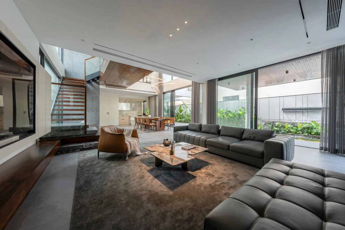 Liên kết theo chiều ngang được hình thành giữa bên trong và bên ngoài, khi lớp cửa kính được mở ra, không gian như hòa làm một. Trong khi đó, bên trong nhà, những khoảng thông tầng tạo liên kết theo chiều đứng, tăng tương tác của gia đình nhưng vẫn đảm bảo mỗi thành viên đều có khoảng không riêng tư.