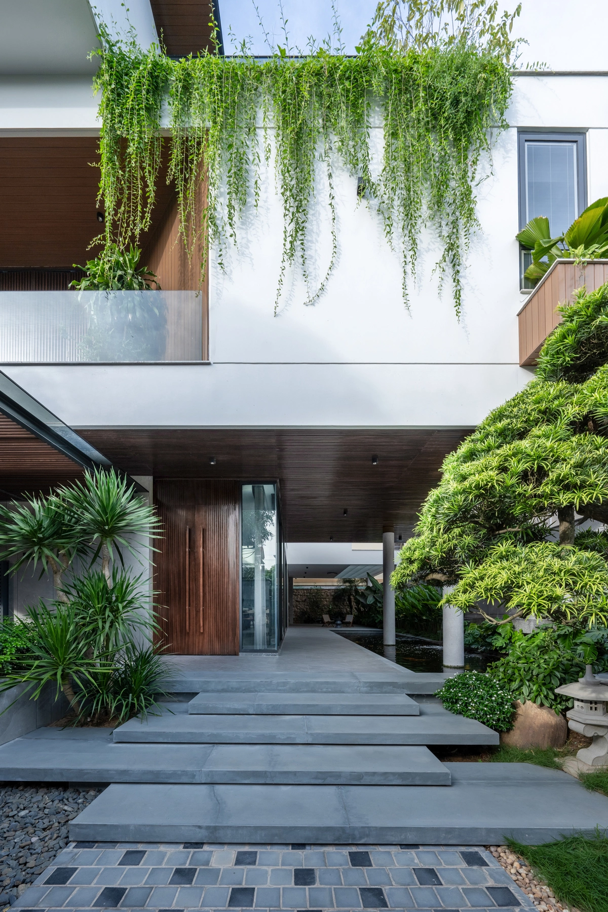 Toàn bộ không gian sinh hoạt được bao bọc bởi sân vườn, hồ cá... giúp điều hòa không khí, tăng tầm nhìn thoáng rộng, gần gũi thiên nhiên.