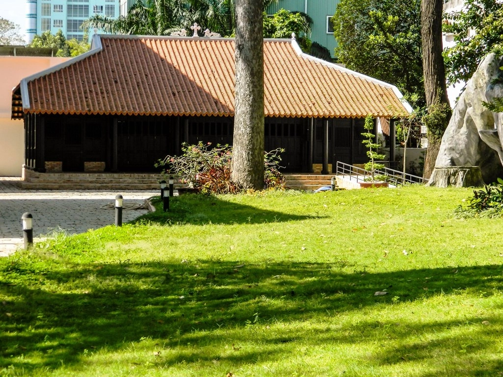 Nằm nép mình bên những tòa nhà cao lớn nhưng ngôi nhà gỗ nhỏ nhắn vẫn toát lên vẻ đẹp thuần khiết cho những ai có dịp ngang qua con phổ sầm uất cổ kính này. Cổng phụ của khuôn viên Tổng Giám mục được đặt trên đường Trần Quốc Thảo, lối vào để du khách được chiêm ngưỡng ngôi nhà cổ hơn 200 năm.