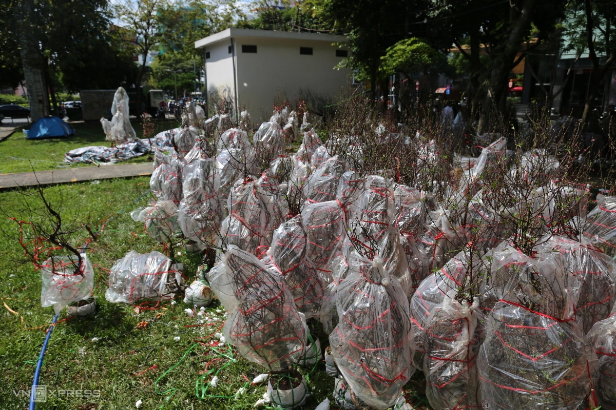 Hàng chục gốc đào ế được bọc túi nylon nằm la liệt trên bãi cỏ công viên chờ nhân viên Công ty môi trường đô thị TP HCM thu gom.