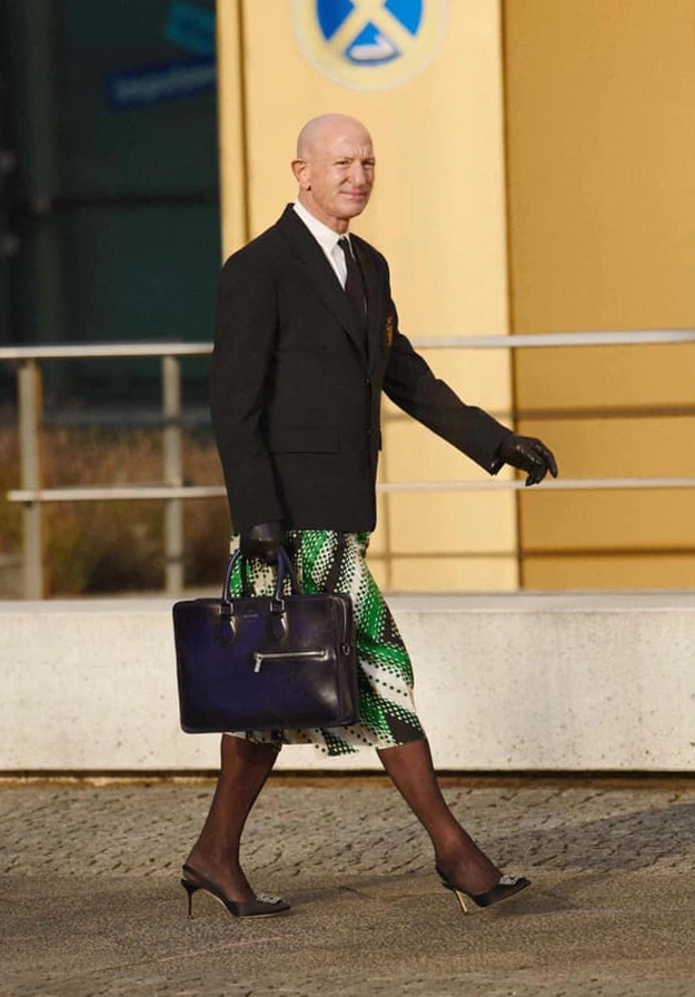 Ngày khác, ông chọn áo khoác hiệu Ernest W. Baker, chân váy hồng của Katya Zelentsova, găng tay Hermes và mang giày theo mốt cọc cạch của Y/Project.