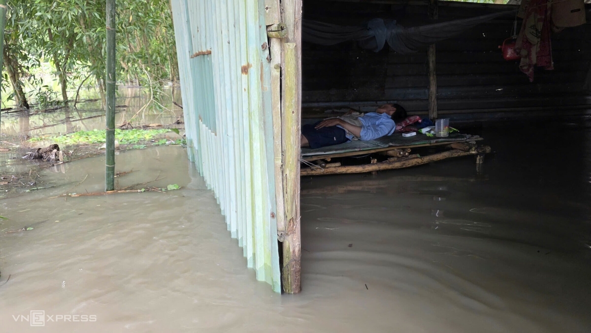 Người đàn ông ngủ trong nhà khi bên dưới nước vẫn còn ngập cao.