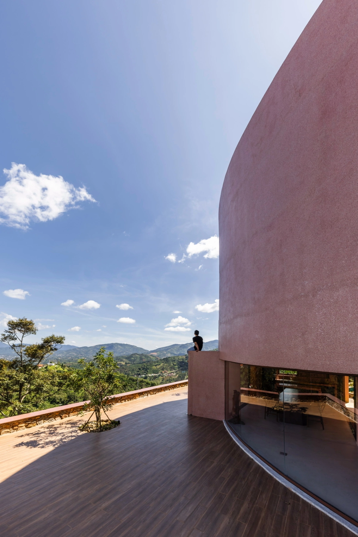 Công trình được hình thành dựa trên nguyên tắc tôn trọng và khai thác tối đa đặc điểm địa hình tự nhiên, đặc biệt là địa hình dốc, để tạo ra các góc nhìn mở rộng và kết nối với cảnh quan xung quanh.