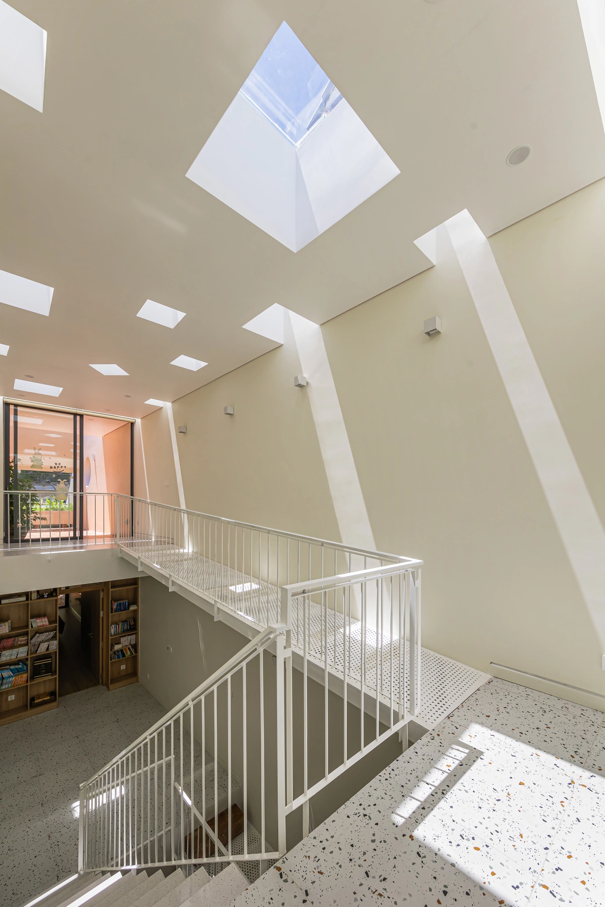 Giếng trời ở giữa nhà được chia thành các phần nhỏ để tối ưu ánh sách, thông gió và giảm hấp thụ nhiệt của kính.