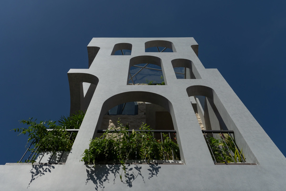 Dựa trên ý tưởng về mặt tiền hai lớp, nhóm KTS thiết kế lớp ngoài là những vòm cung và chi tiết cách điệu gợi nhắc đến kiến trúc tôn giáo. Cách thiết kế này giúp ngôi nhà vừa đón gió, ánh sáng, vừa giữ sự riêng tư cho không gian bên trong.