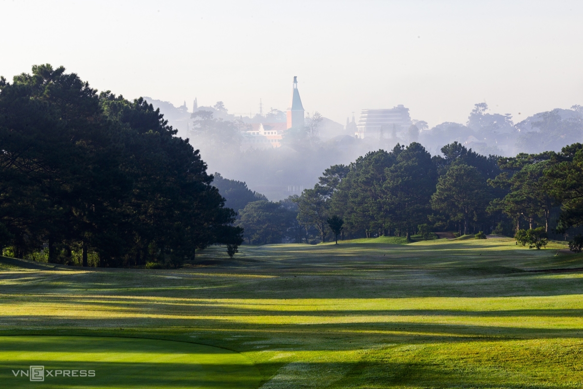 Nắng vàng trên khu vực đồi Cù và sân golf cạnh hồ Xuân Hương, với hướng nhìn phía xa là Trường Cao đẳng Sư phạm Đà Lạt.