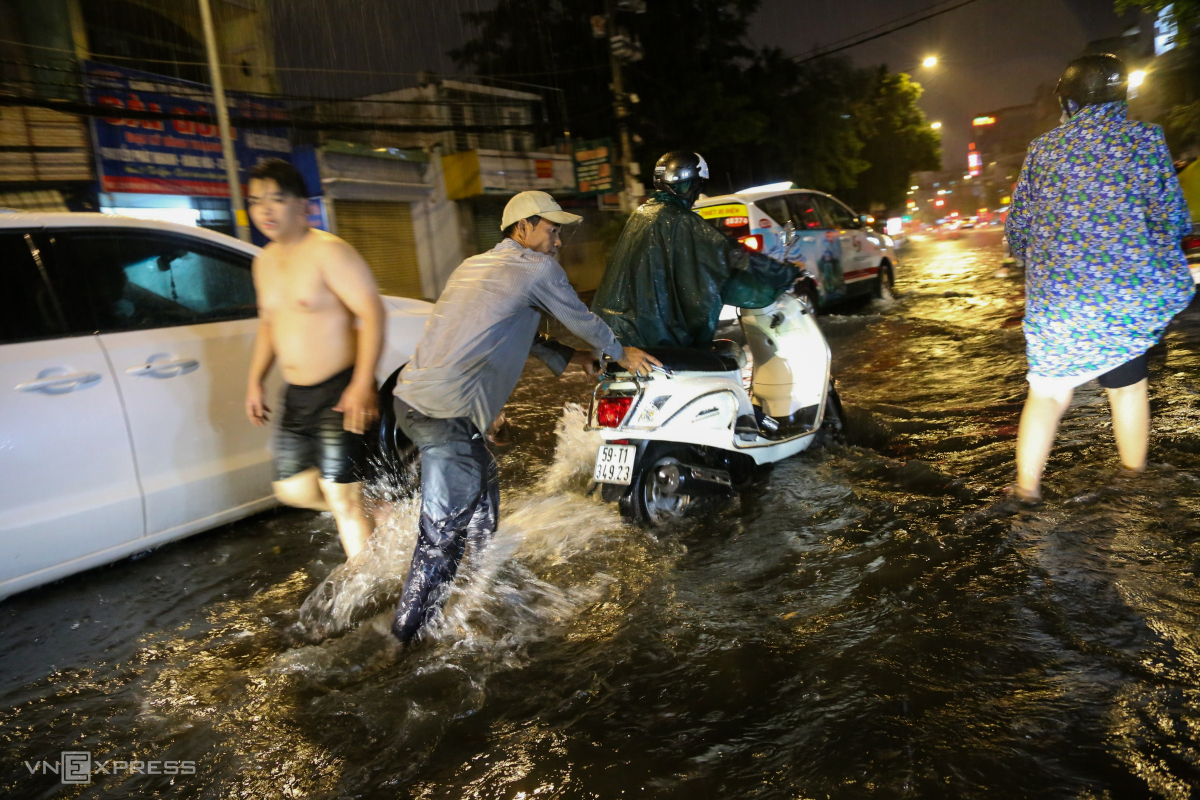 Nước ngập lút bánh xe trên đường Đinh Bộ Lĩnh, quận Bình Thạnh, đoạn trước Bến xe miền Đông. Hàng loạt xe chết máy tại giao lộ Đinh Bộ Lĩnh - Nguyễn Xí khiến giao thông rối loạn.