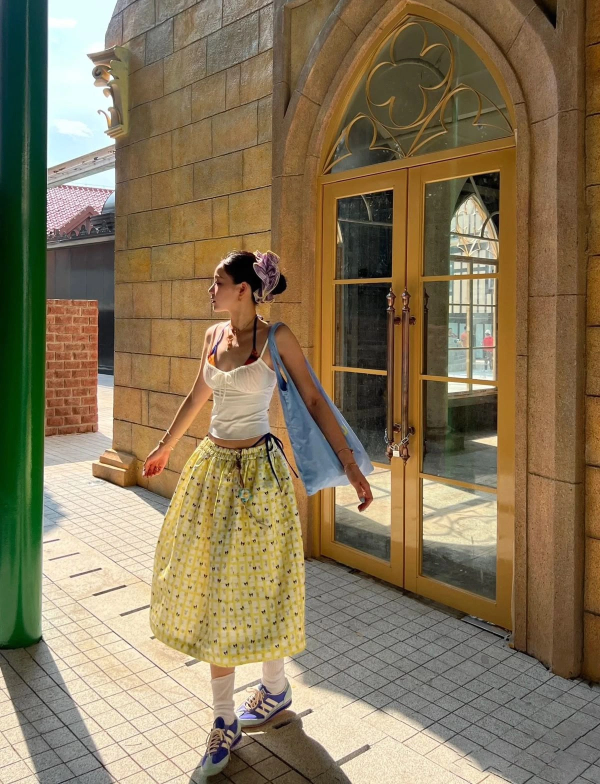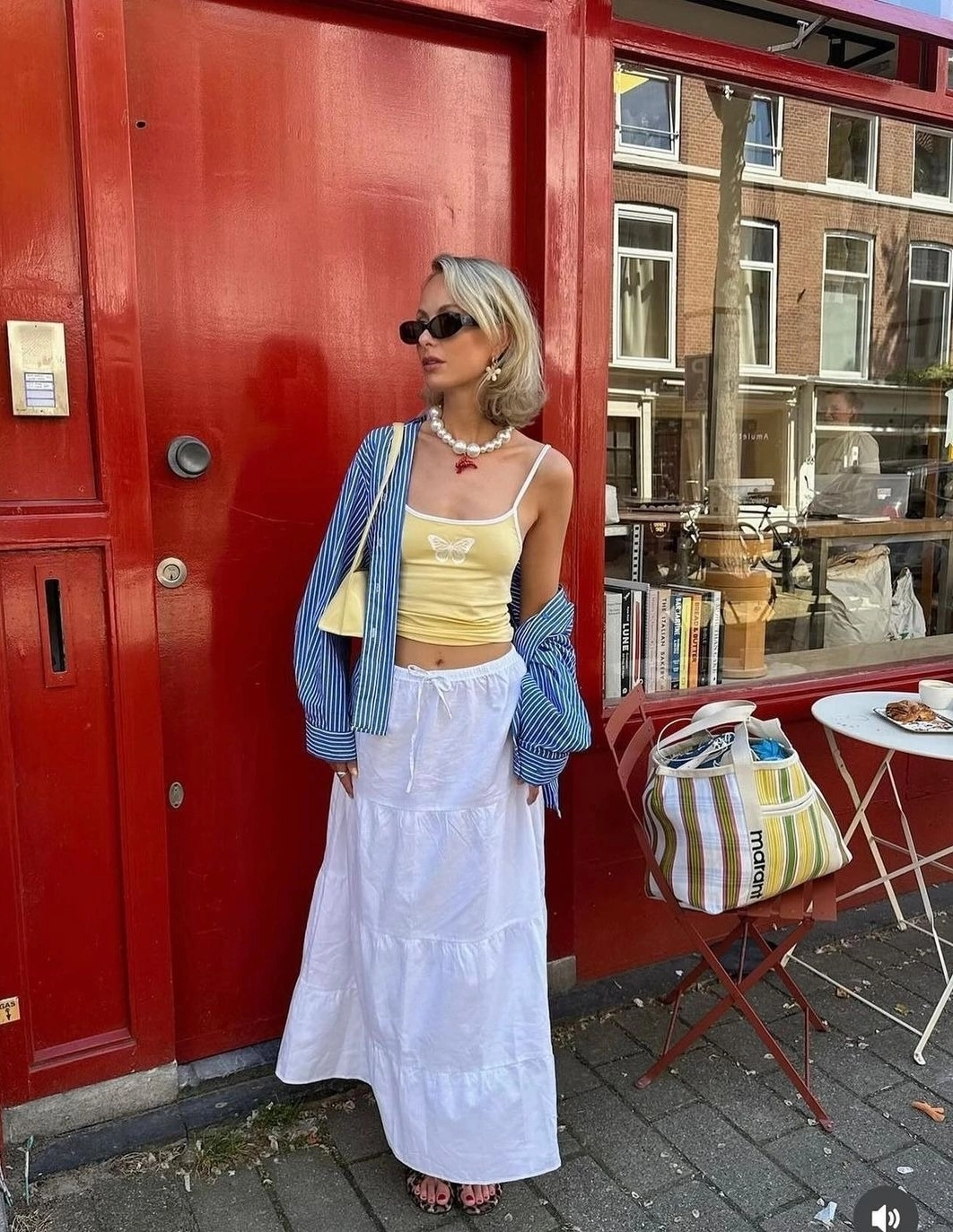 Cũng là kiểu mặc này nhưng kết hợp với tất và sneakers sẽ tạo nên phong cách trẻ trung và năng động. Thay vì túi cói và chân váy maxi, hãy chọn túi tote và chân váy midi.