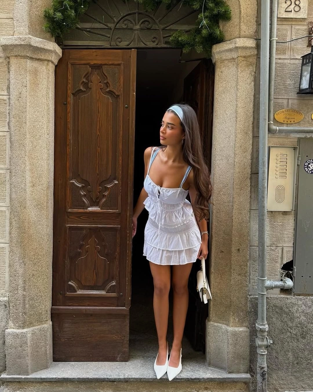 Áo hai dây và chân váy mini chất liệu cotton phù hợp với những buổi cà phê cùng bạn bè, hẹn hò hoặc đi dạo.