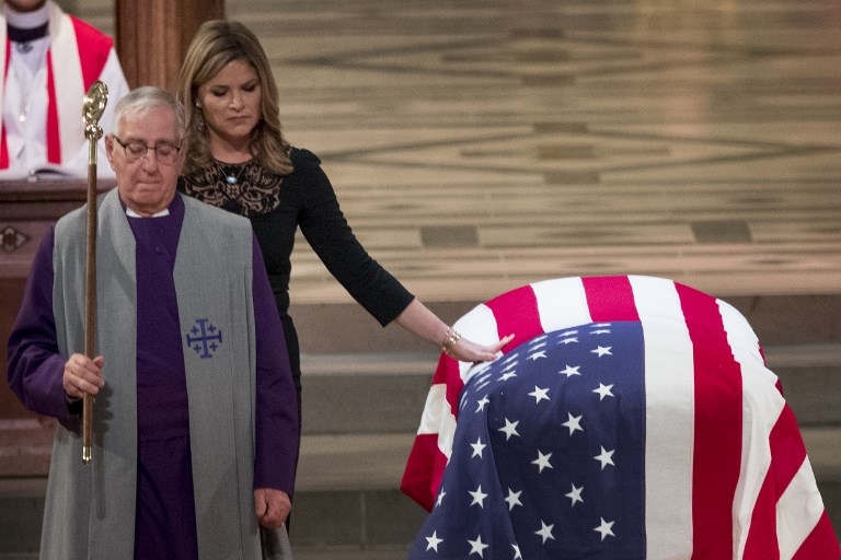 Jenna Bush Hager, cháu của cố tổng thống Bush, đặt tay lên linh cữu ông sau khi cô lên bục phát biểu để đọc Kinh thánh.
