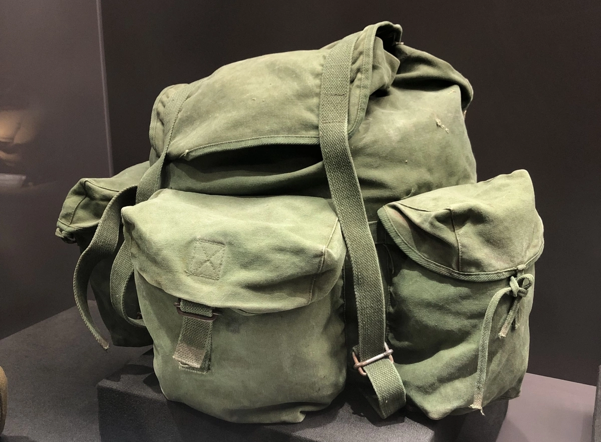 "Chú là chú em/ Chú đi tiền tuyến, nửa đêm chú về/ Ba lô con cóc to bè/ Mũ tai bèo bẽ vành xòe trên vai". Chiếc ba lô con cóc xanh rêu đã vào bài thơ Chú giải phóng quân của tác giả Cẩm Thơ với giọng văn trong trẻo và thân thuộc. Trong những năm chống Mỹ, chiến dịch xẻ dọc Trường Sơn, ba lô con cóc như người bạn tri kỷ, chứa đựng những kỷ niệm của người lính trong cuộc đời quân ngũ. Ảnh: Ý Ly