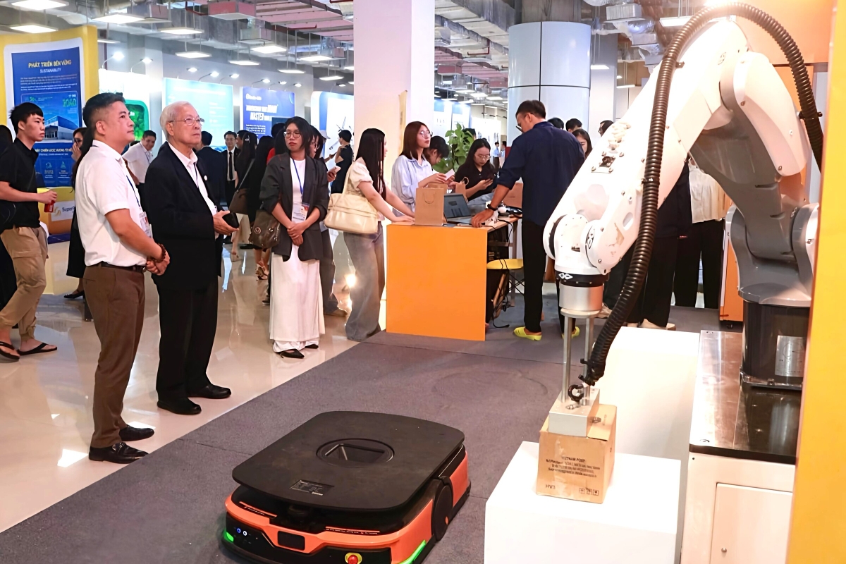 Tại gian hàng của Bưu điện Việt Nam, một số loại robot được dùng trong các kho hàng cũng được mang tới trình diễn. Trong hình, ông Đỗ Trung Tá, nguyên Bộ trưởng Bưu chính - Viễn thông ghé thăm, xem robot vận chuyển, cùng cánh tay robot sắp xếp, phân loại hàng hóa với độ chính xác cao.