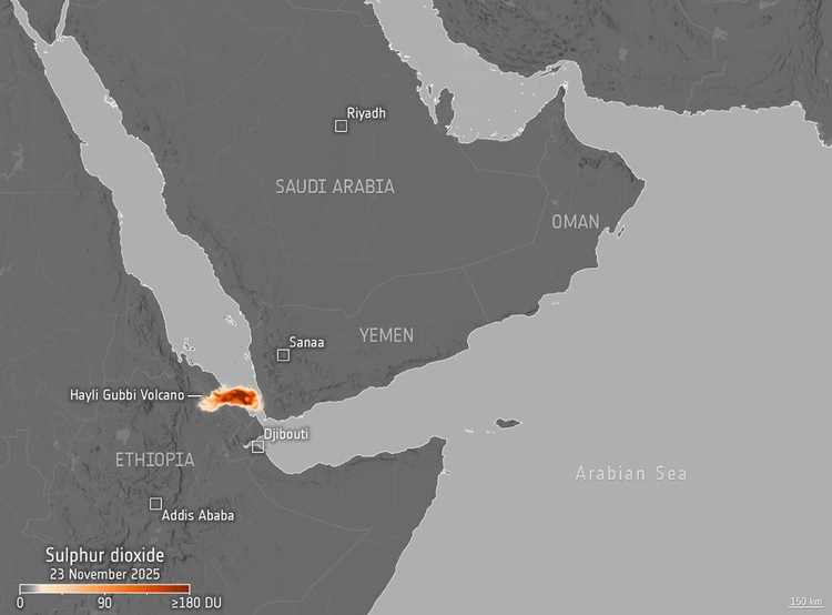 Đám mây tro bụi đạt độ cao ít nhất 13,7 km, ban đầu dạt về phía đông bắc qua Yemen và Oman. Ngày 24/11, đám mây tiếp tục di chuyển về phía đông bắc, lan rộng khắp miền bắc Ấn Độ và một số vùng thuộc Trung Quốc. Hình ảnh do vệ tinh Sentinel-5P của Cơ quan Vũ trụ châu Âu (ESA) chụp sau vụ phun trào hé lộ phạm vi và sự di chuyển của nó ngày 23-24/11.