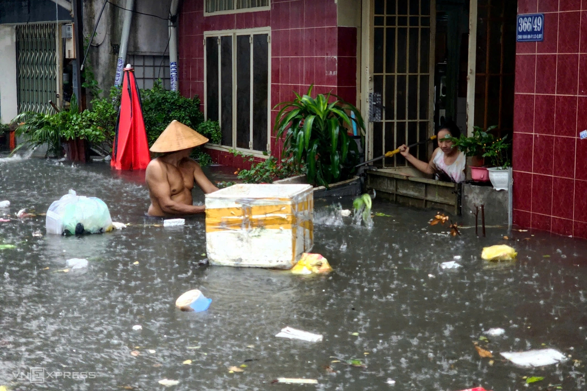 Ông Lộc, 60 tuổi, dùng cây gỗ vớt rác, khơi thông miệng cống thoát nước. "Mưa kéo theo rác từ phía chợ trên cao xuống khiến ngập nặng hơn. Tôi phải cố vớt rác chứ không ngập kéo dài đến tối", ông Lộc nói.
