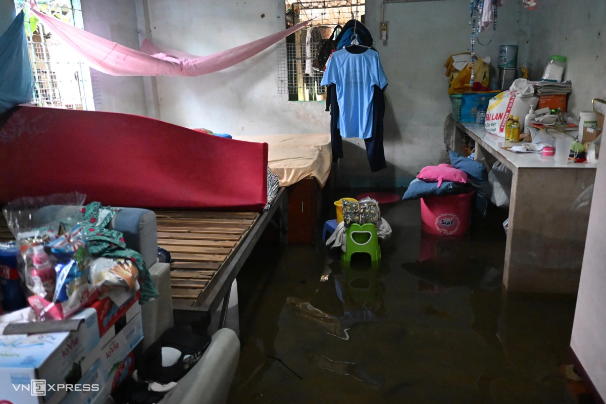Nước tràn vào phòng ngủ gia đình bà Phương. Nhiều đồ đạc chỉ kê tạm, chờ nước rút.
