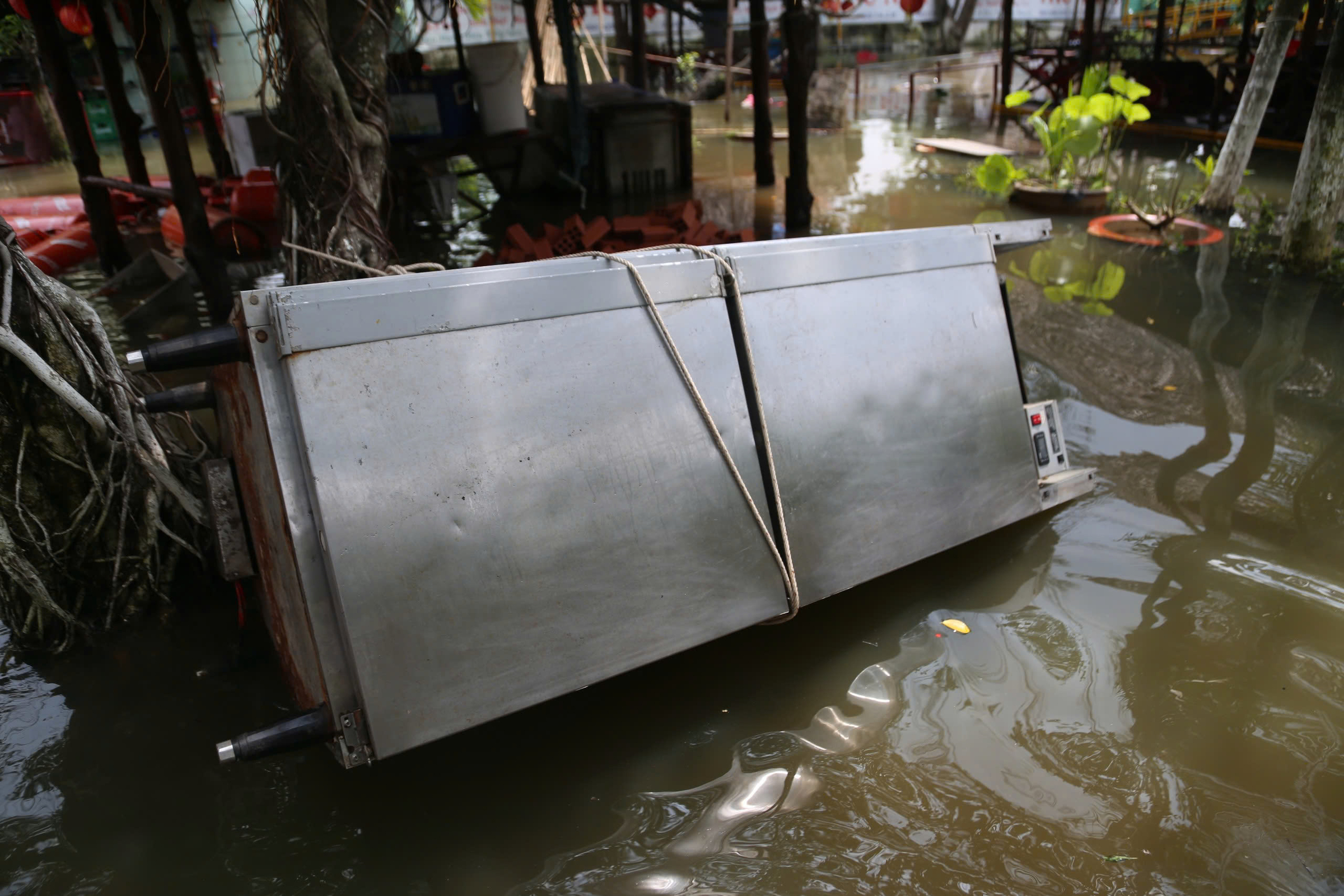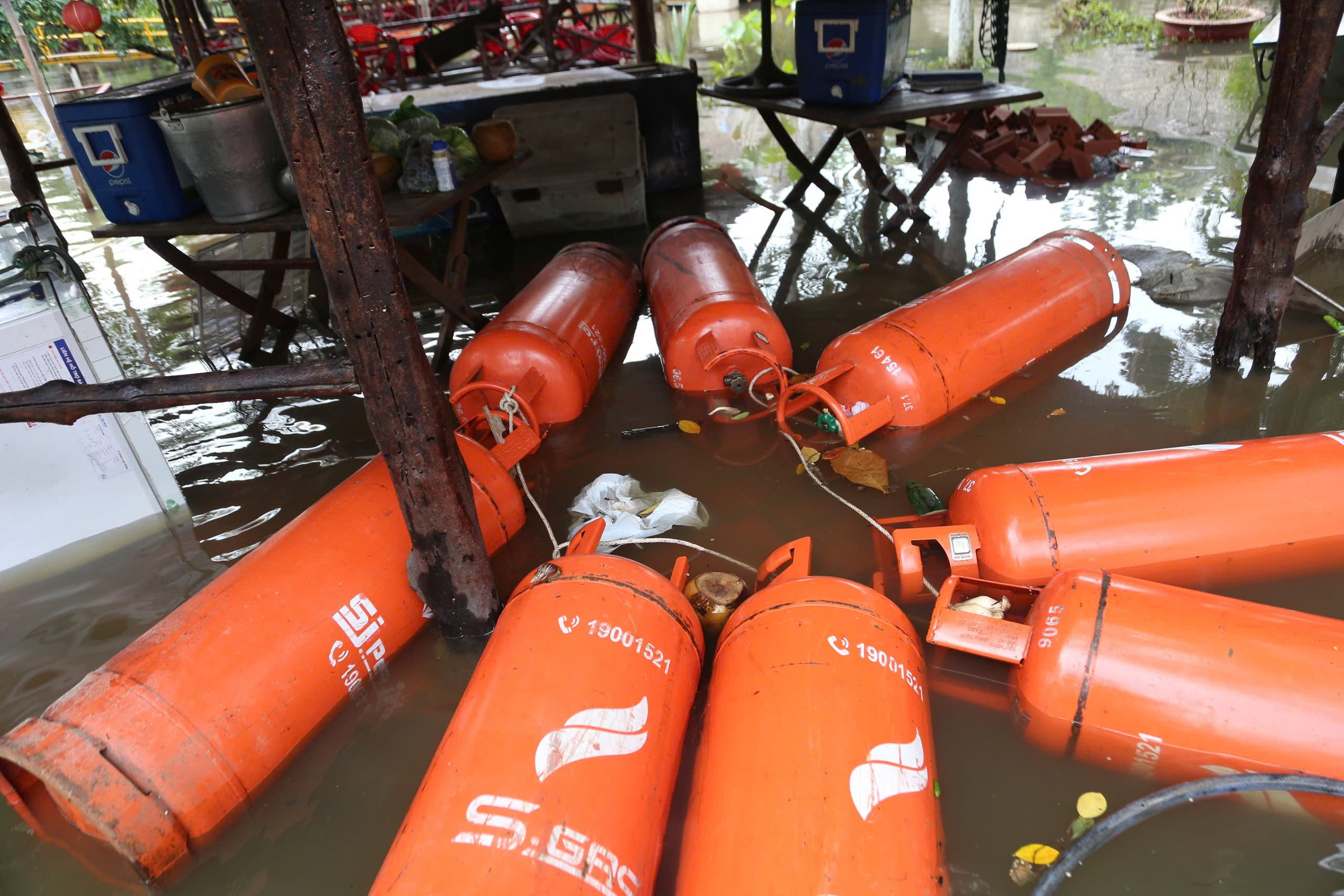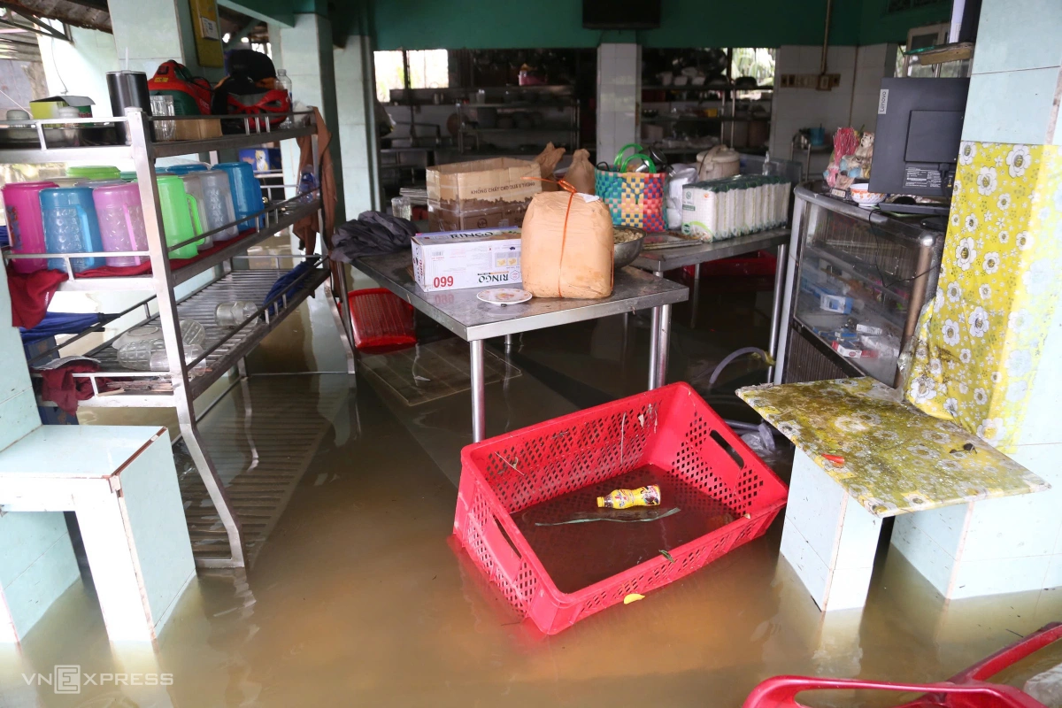 Nước chảy vào khu bếp quán ăn, một số sọt nhựa, bàn ghế nổi bồng bềnh.