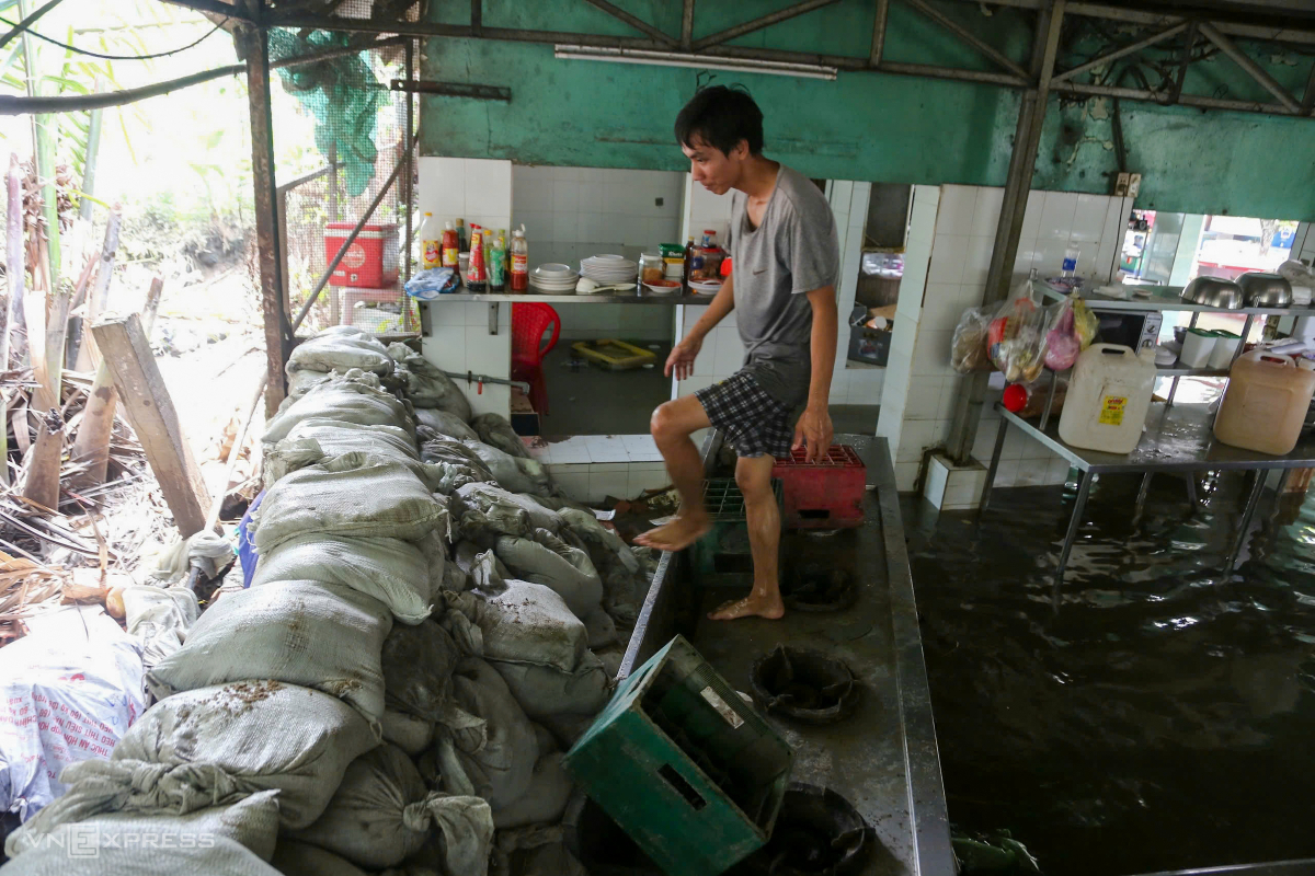 Tối qua nước sông Sài Gòn bất ngờ dâng cao, làm đổ sập bờ bao khoảng một mét trong quán ăn ở khu dân cư Bình Quới. Nước sông tràn vào trong bếp và sân. Trưa nay, chủ quán huy động người đắp cao bờ kè hạn chế lũ tiếp tục tràn vào.