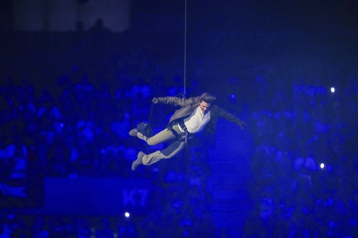 Gần cuối, tài tử Tom Cruise - diễn viên nổi tiếng người Mỹ - xuất hiện trên nóc sân Stade de France rồi nhảy xuống dưới, chia vui cùng khán giả. Anh còn lái xe máy, cầm cờ từ Biles rồi rời khỏi sân khấu, báo hiệu cuộc chuyển giao giữa chủ nhà Olympic 2024 và 2028.