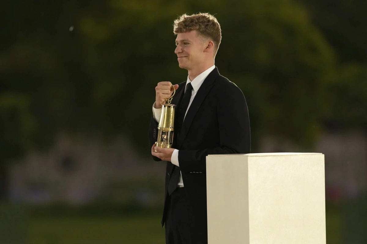 VĐV bơi giành bốn HC vàng, một đồng tại Olympic 2024, Leon Marchand xuất hiện trước tiếng hô vang của khán giả Pháp. Kình ngư 22 tuổi của Pháp cầm theo chiếc đèn giữ ngọn lửa Olympic.