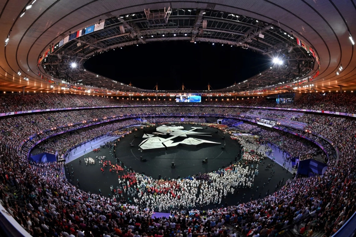 Sau lễ diễu hành của các đoàn, tiết mục nghệ thuật bắt đầu với bữa tiệc ánh sáng. Paris có biệt danh "Thành phố Ánh sáng", và trong hình có cảm giác các tia sáng sáng được chiếu xuống từ trên bầu trời.