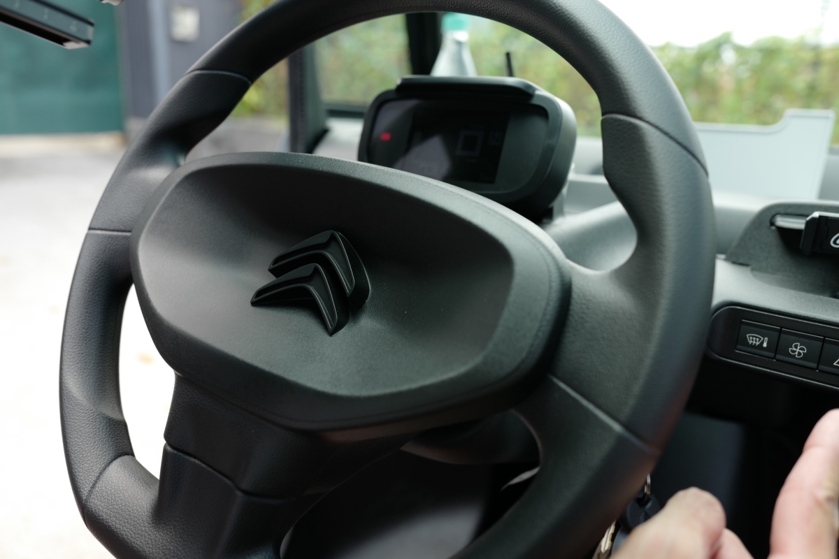 Xe không có hệ thống giải trí, không có điều hòa, chỉ có quạt gió và hệ thống sưởi phù hợp với khí hậu lạnh tại châu Âu và một cổng sạc USB. Logo Ami chính giữa còn là vị trị kẹp điện thoại, bên cạnh là nơi treo túi.