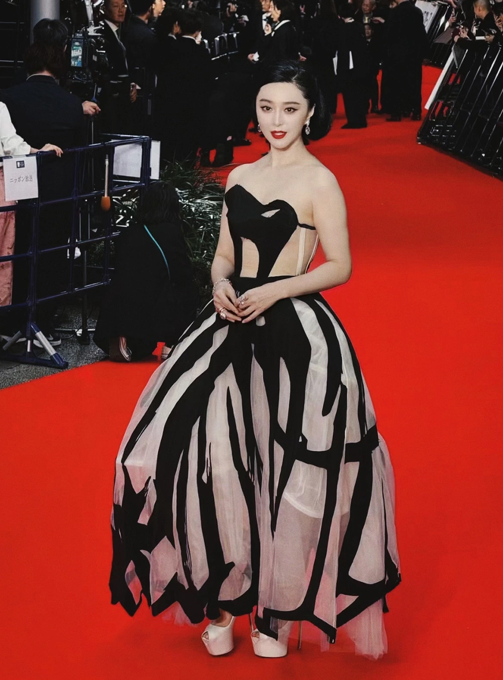 Phạm Băng Băng trong thiết kế thuộc bộ sưu tập Thu 2025 của Steve O Smith. Chiếc váy lấy cảm hứng cánh bướm đen trắng, cô kết hợp kiểu tóc, lối trang điểm cổ điển.